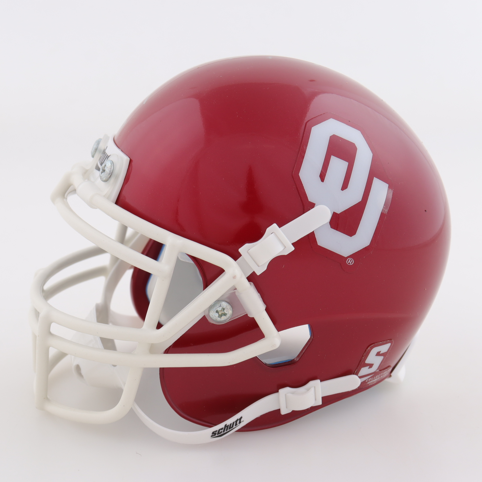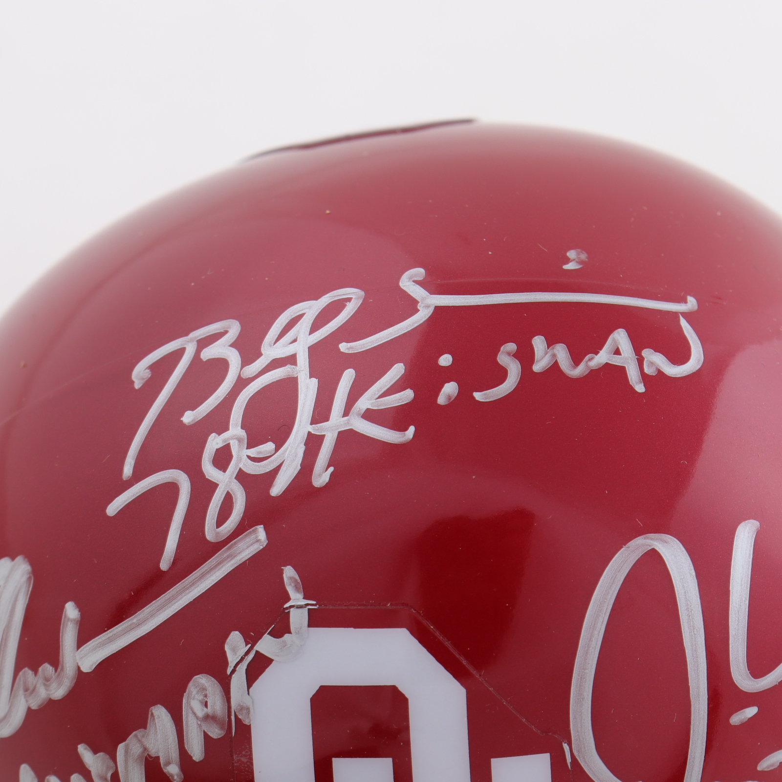 Schutt Oklahoma Sooners mini helmet. Hand-signed by Billy Sims, Steve Owens, and Jason White.