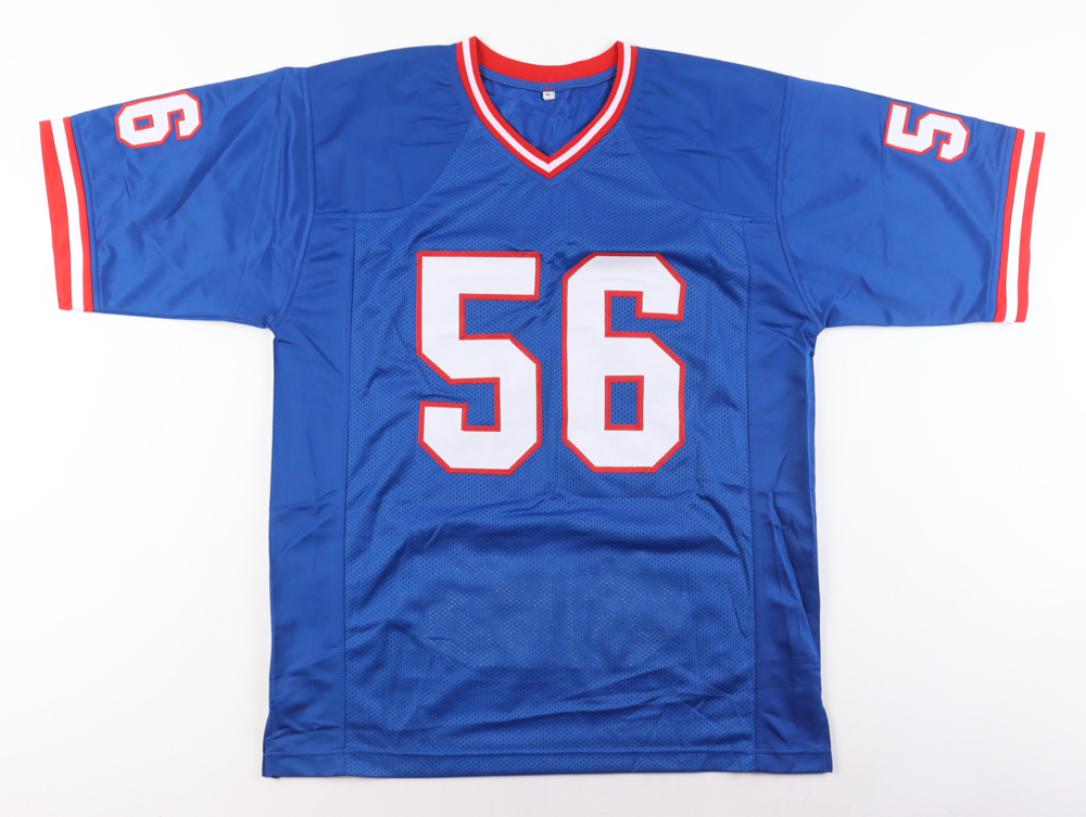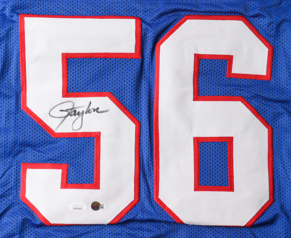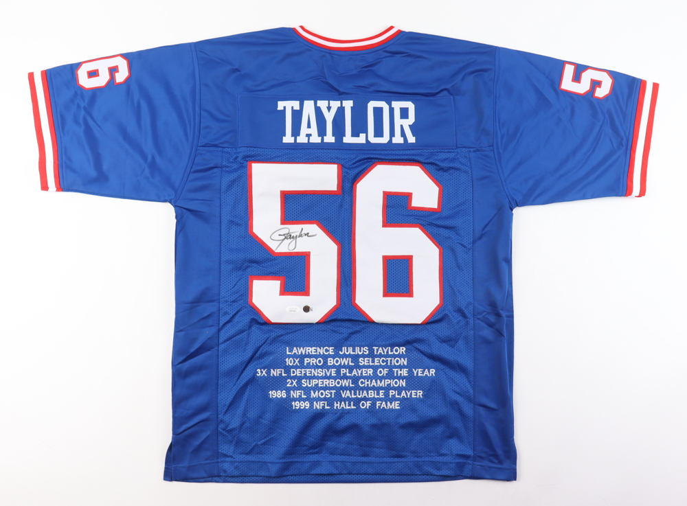 Custom jersey. Everything is sewn on, size XL. Hand-signed by Lawrence Taylor (HOF). Taylor's career stats have been custom stitched in the jersey below the reverse numbers.