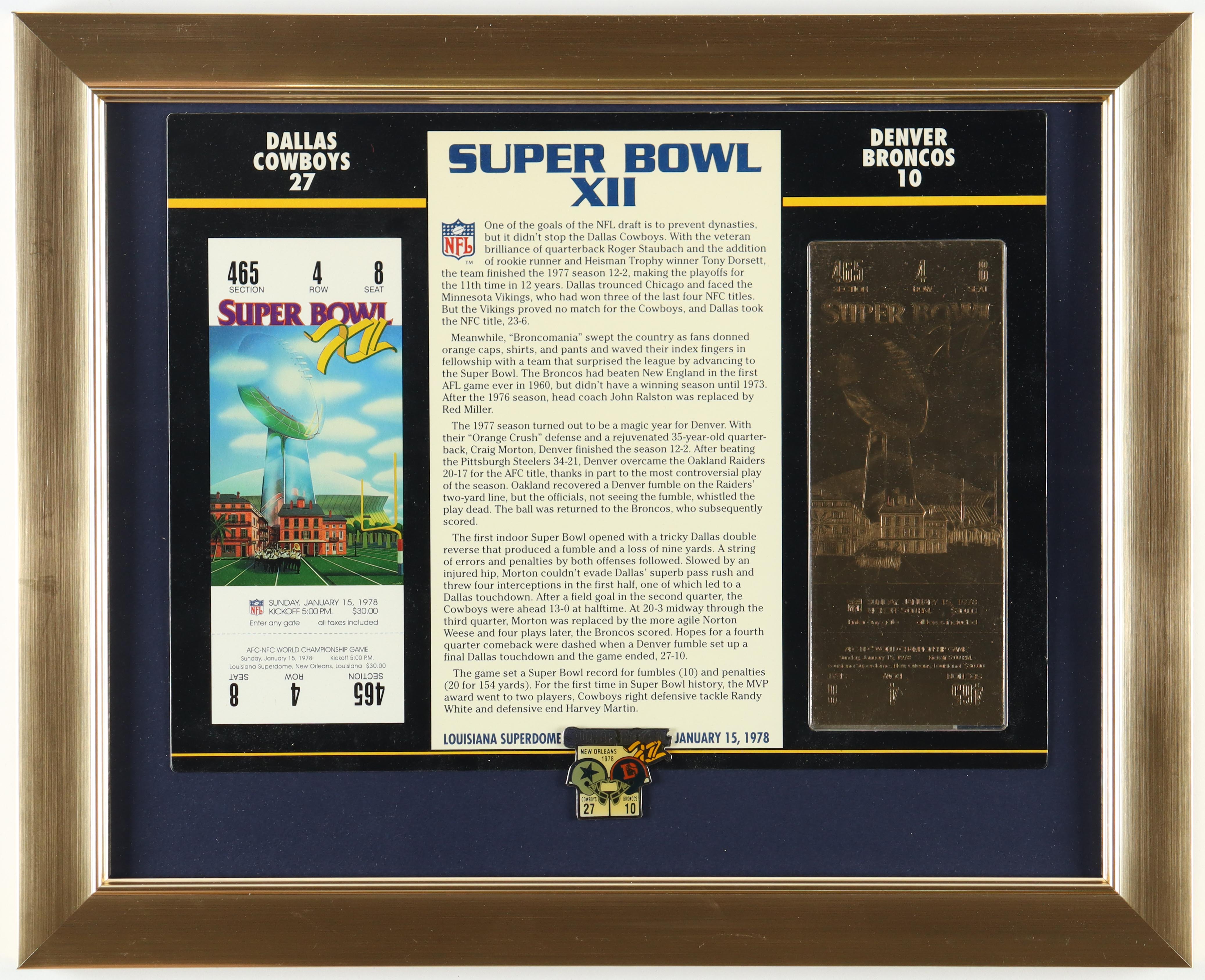 Dallas Cowboys 23KT Gold Super Bowl XII Custom Framed Ticket Display With Official Super Bowl XII Pin