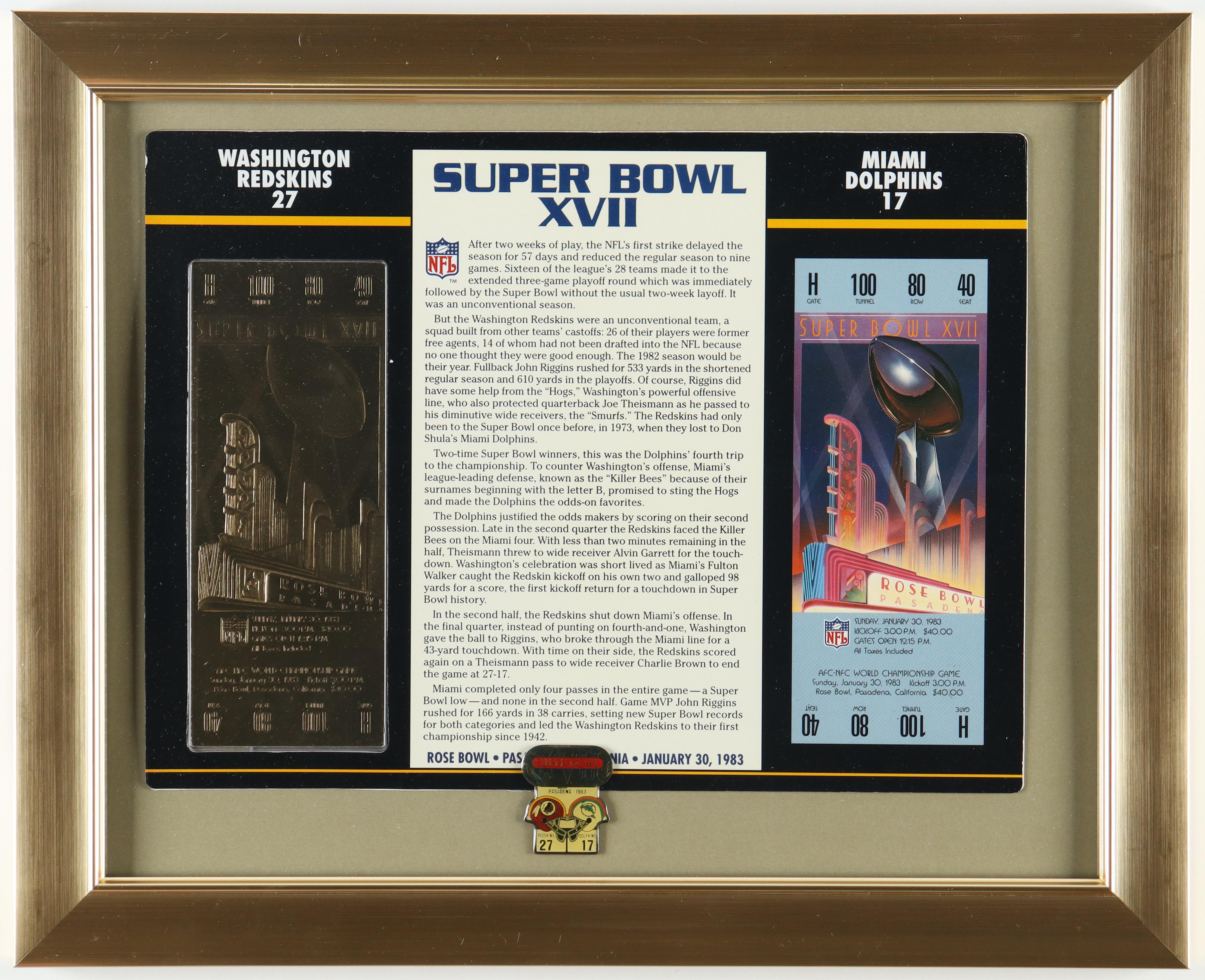 Washington Redskins 23KT Gold Super Bowl XVII Custom Framed Ticket Display With Official Super Bowl XVII Pin