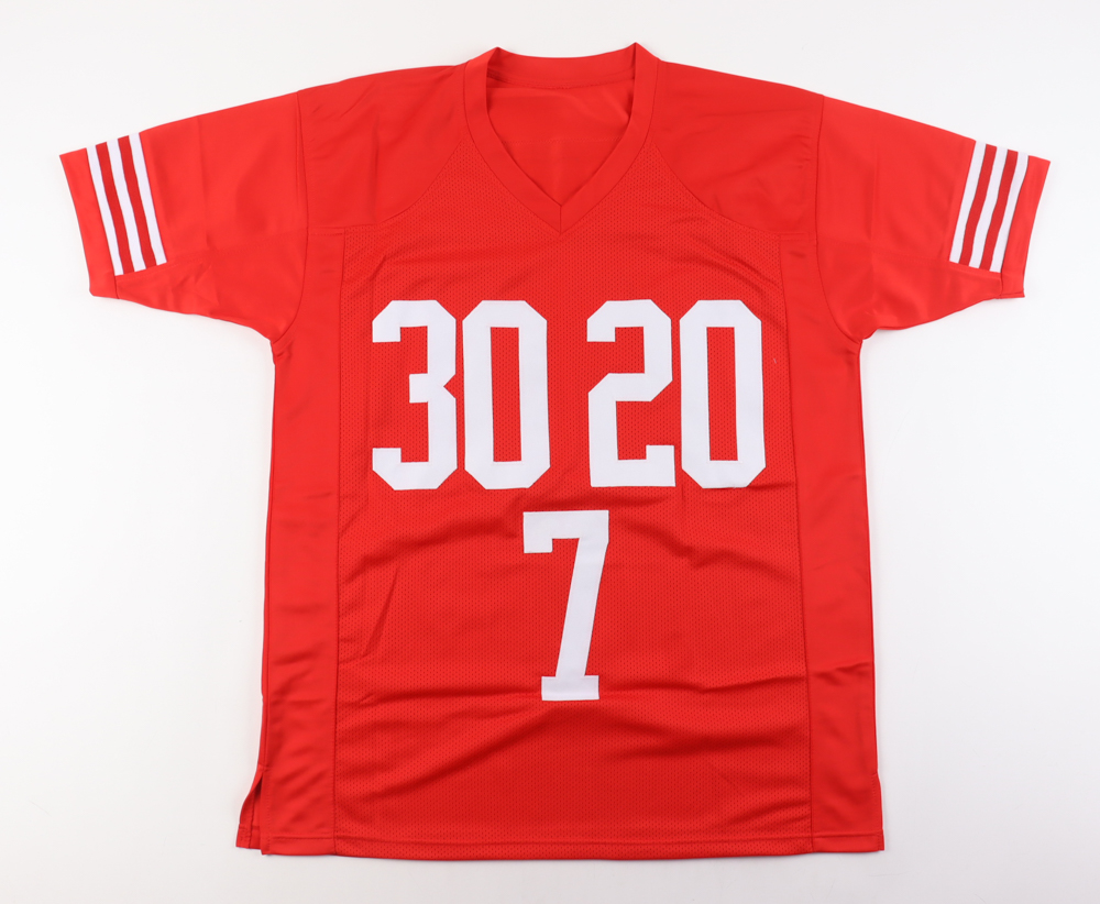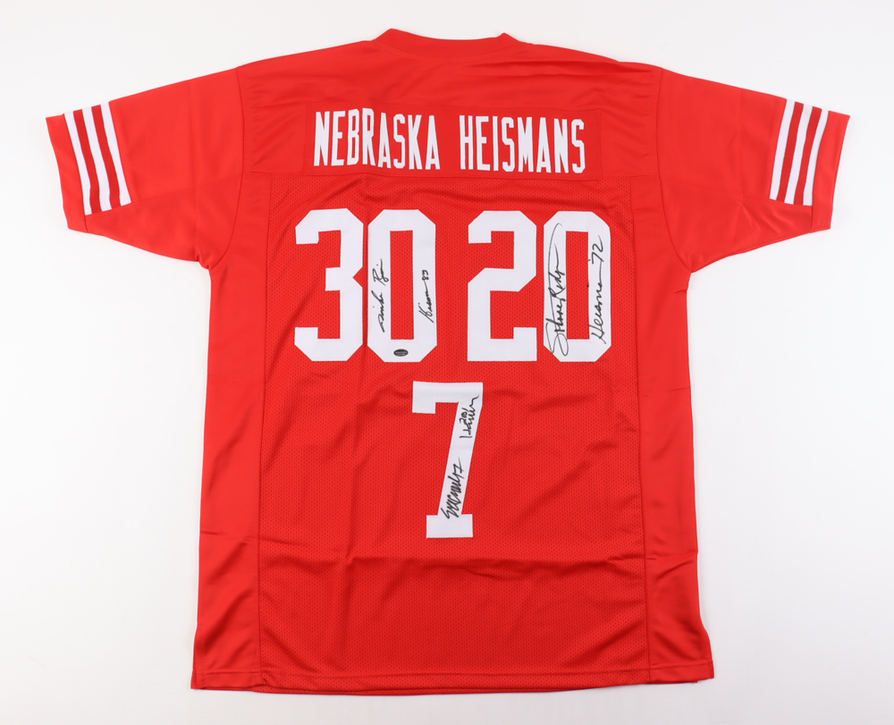 Custom jersey. Everything is sewn on, size XL. Has been hand-signed and inscribed by Mike Rozier, Johnny Rodgers, and Eric Crouch.