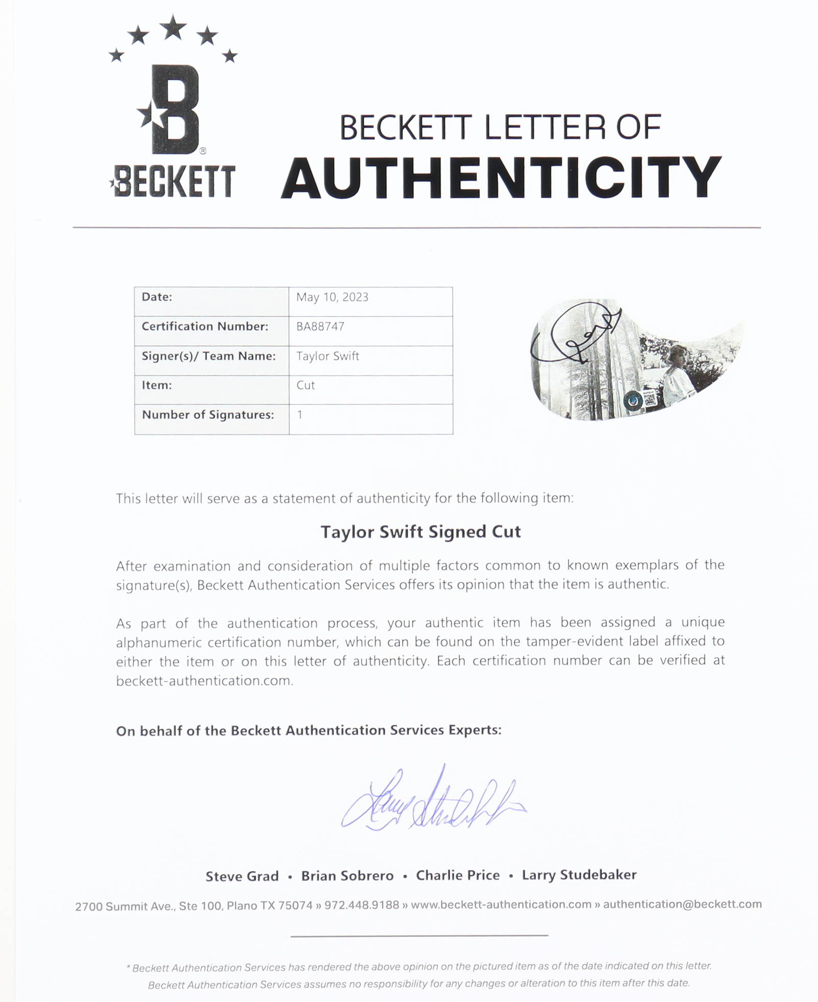 The autograph includes an official Beckett Authentication Services hologram and matching LOA for authenticity purposes.