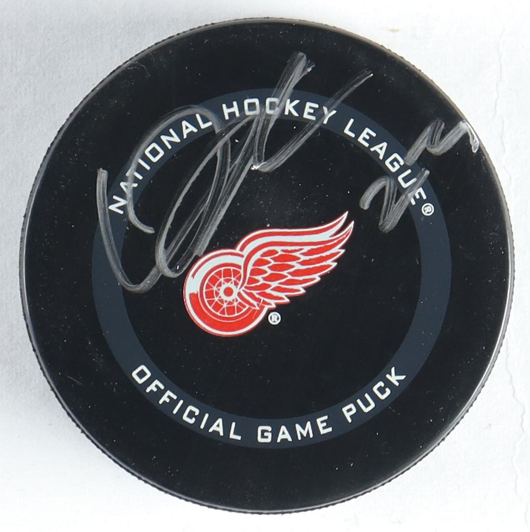 Lucas Raymond Signed Red Wings Logo Puck (Fanatics)