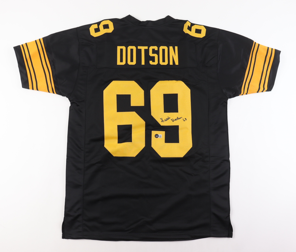 Custom jersey. Everything is sewn on, size XL. Hand-signed by Kevin Dotson.