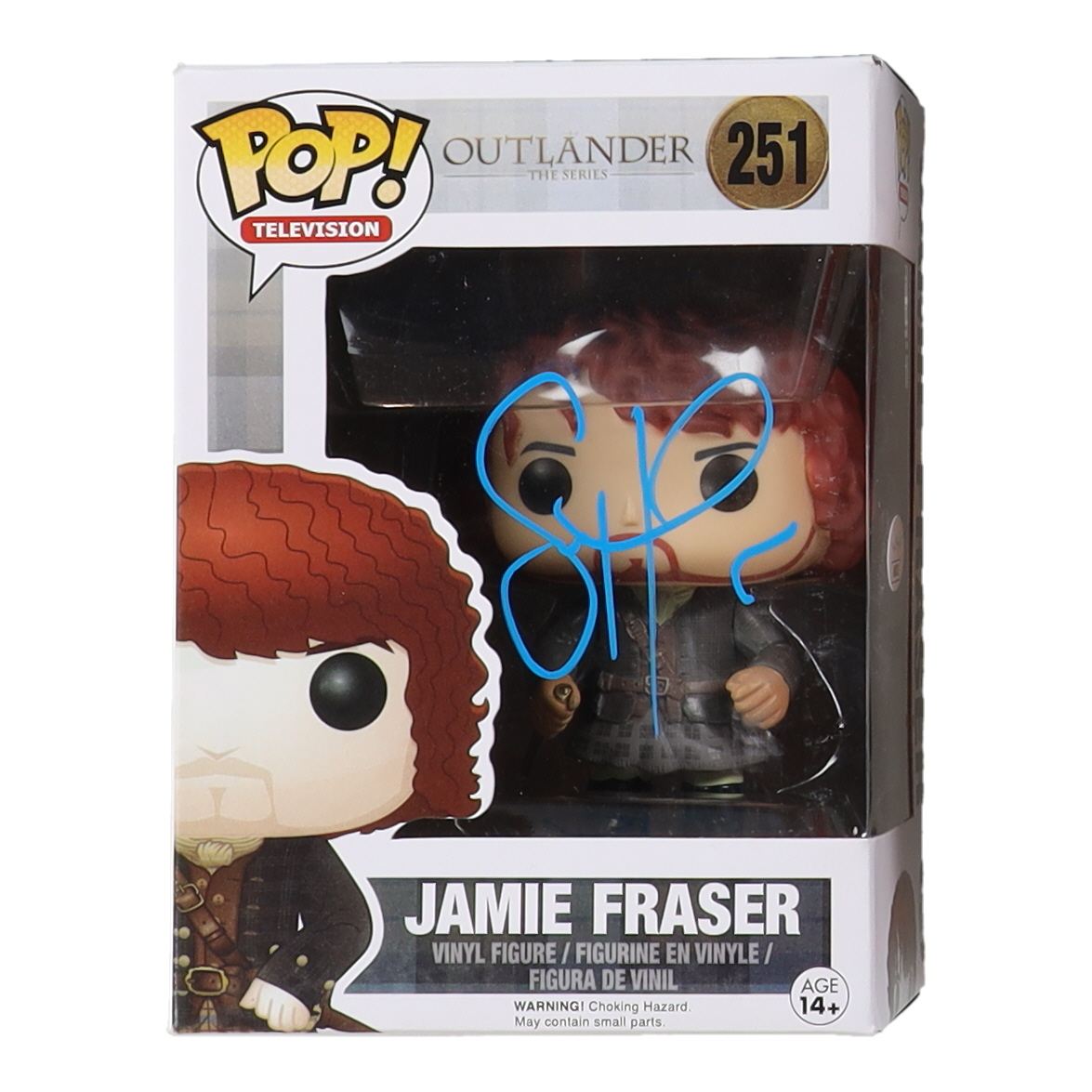Funko Pop! figure measures approximately 4" tall and comes in original packaging. Hand-signed on the front packaging of the box by Sam Heughan.