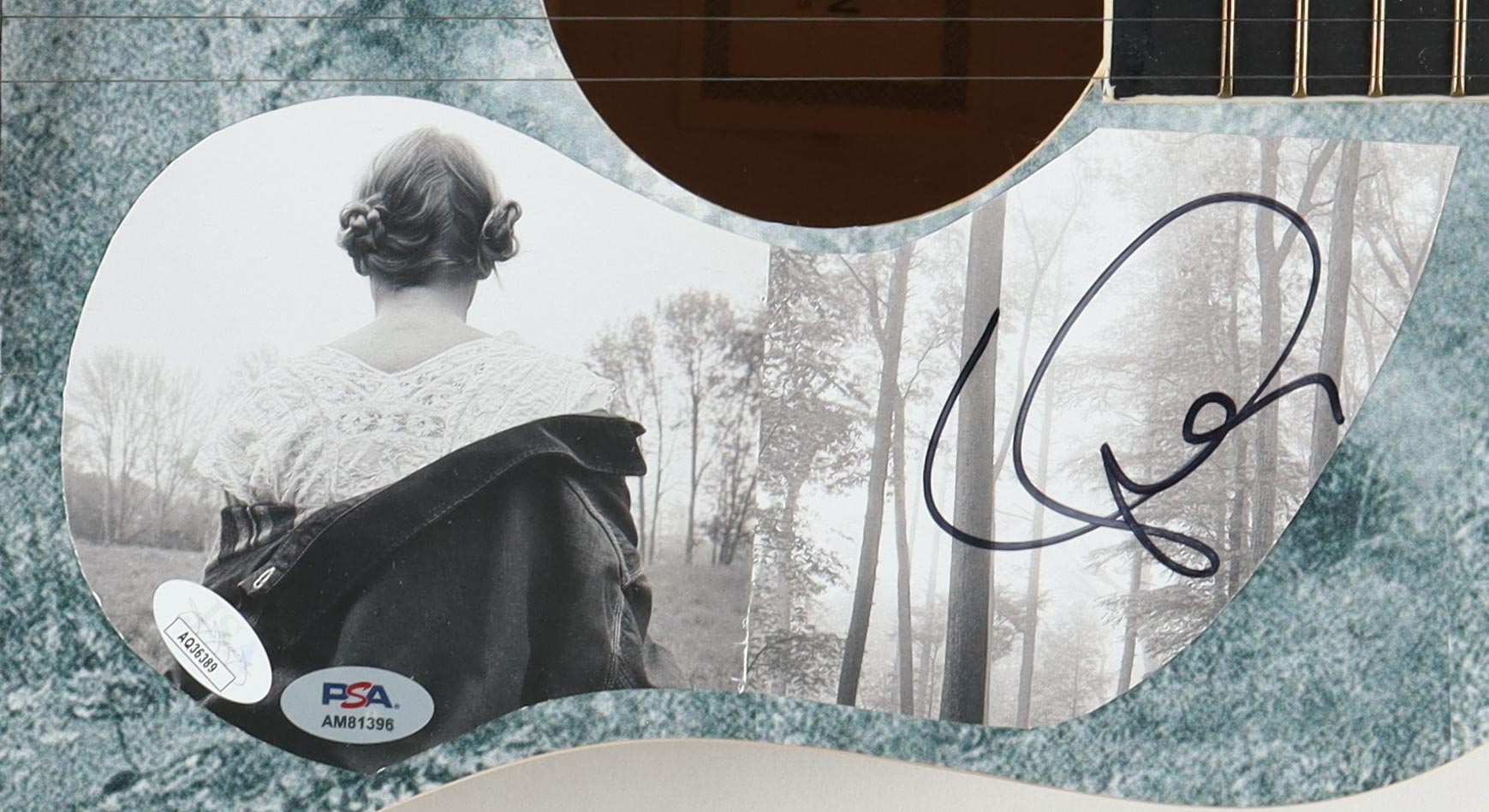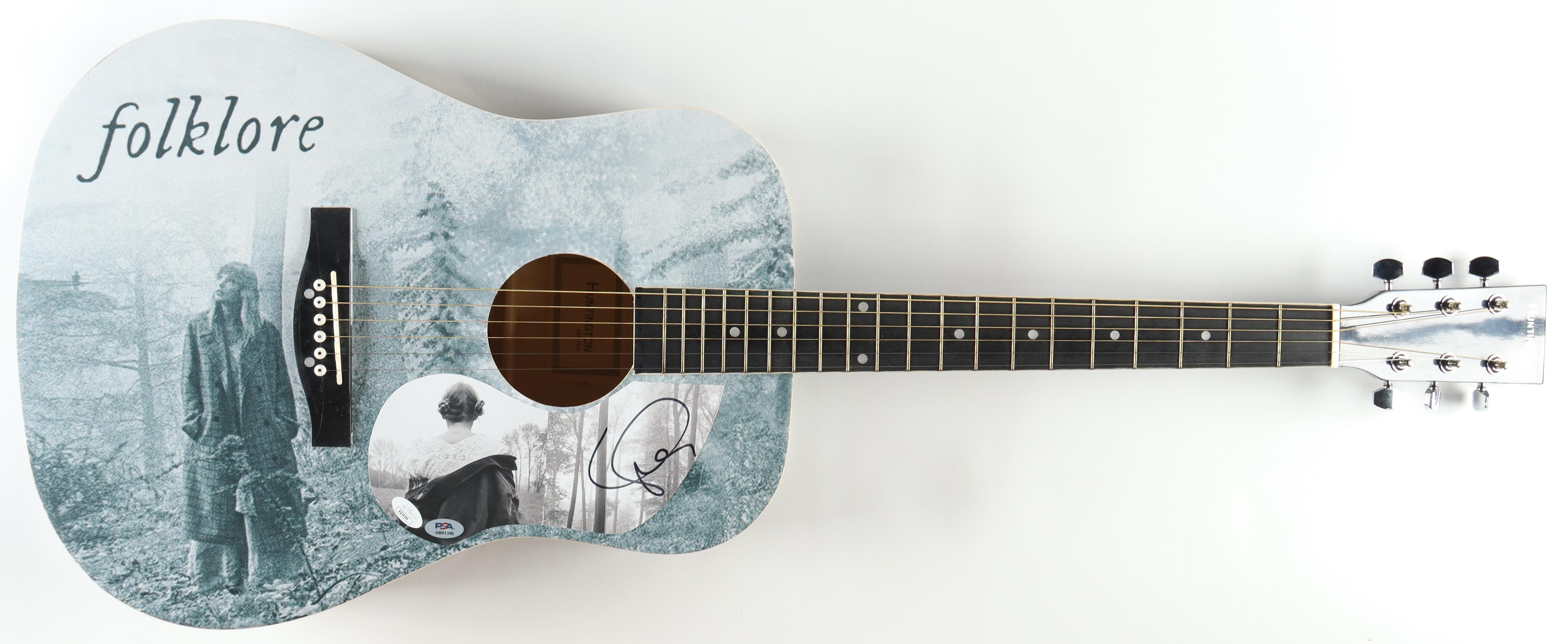 Acoustic Guitar measures approximately 38" in length and has been hand-signed on a CD cover that has been repurposed as the pick-guard by Taylor Swift.