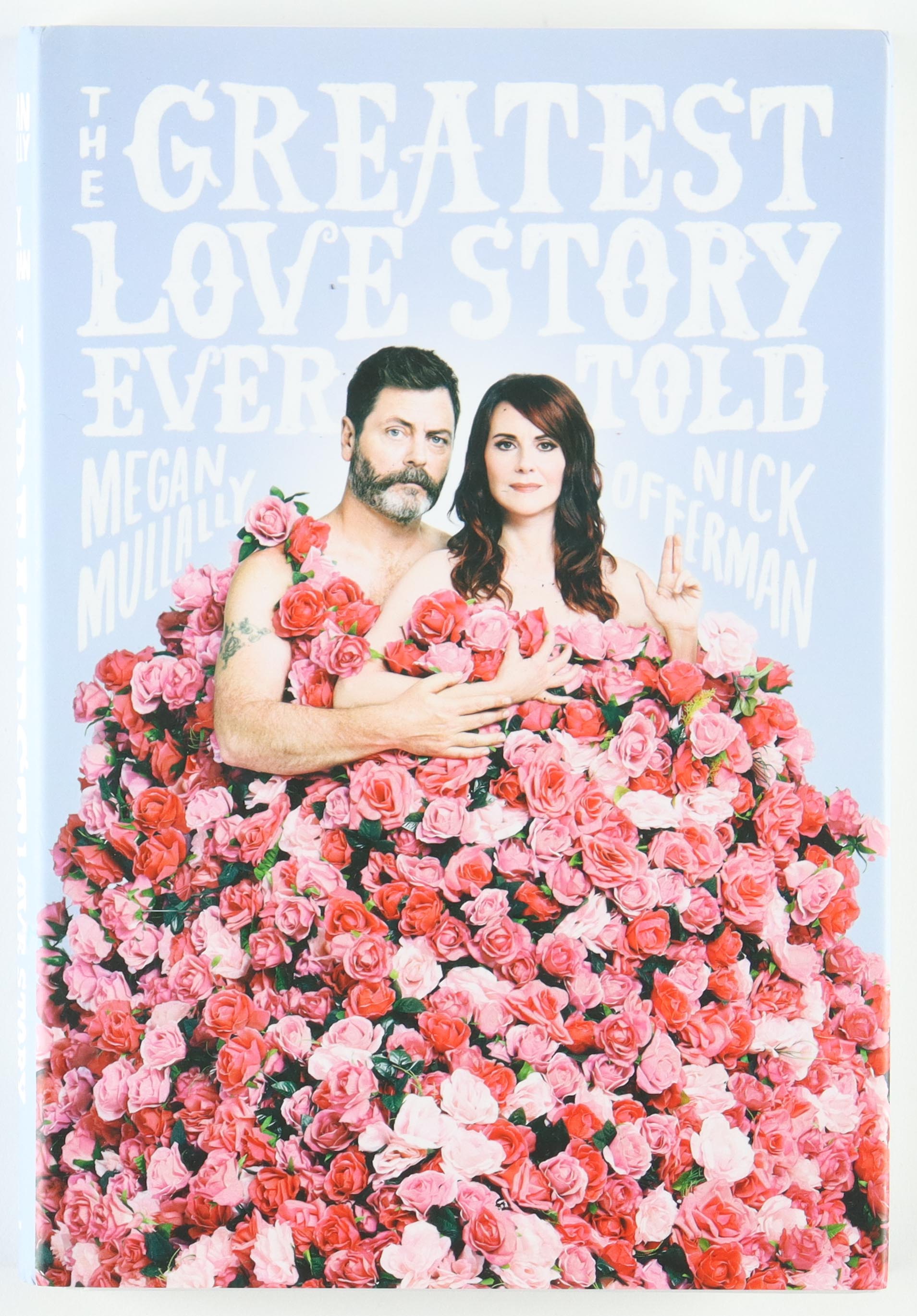 "The Greatest Love Story Ever Told" hard-cover book, hand-signed in the inside cover page by Megan Mullally & Nick Offerman.