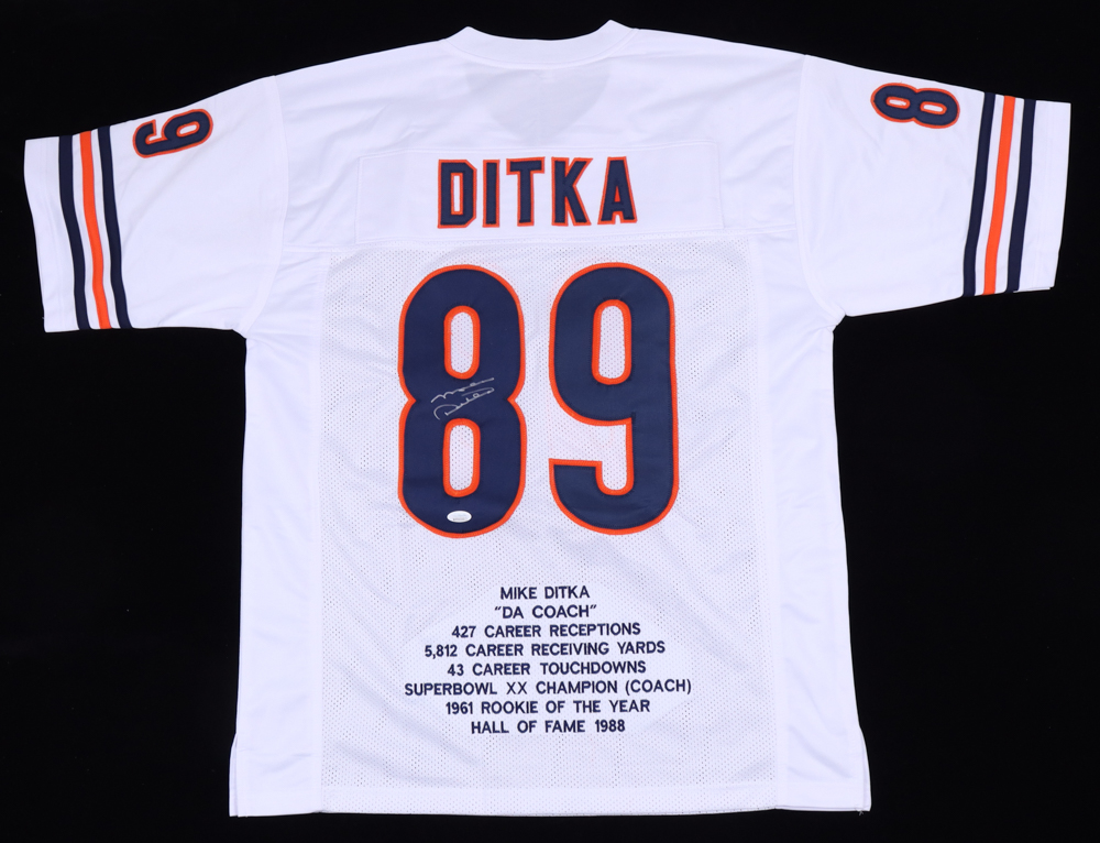 Custom jersey. Everything is sewn on, size XL. Hand-signed by Mike Ditka (HOF). Ditka's career highlights have been custom stitched onto the back of the jersey below the reverse numbers.