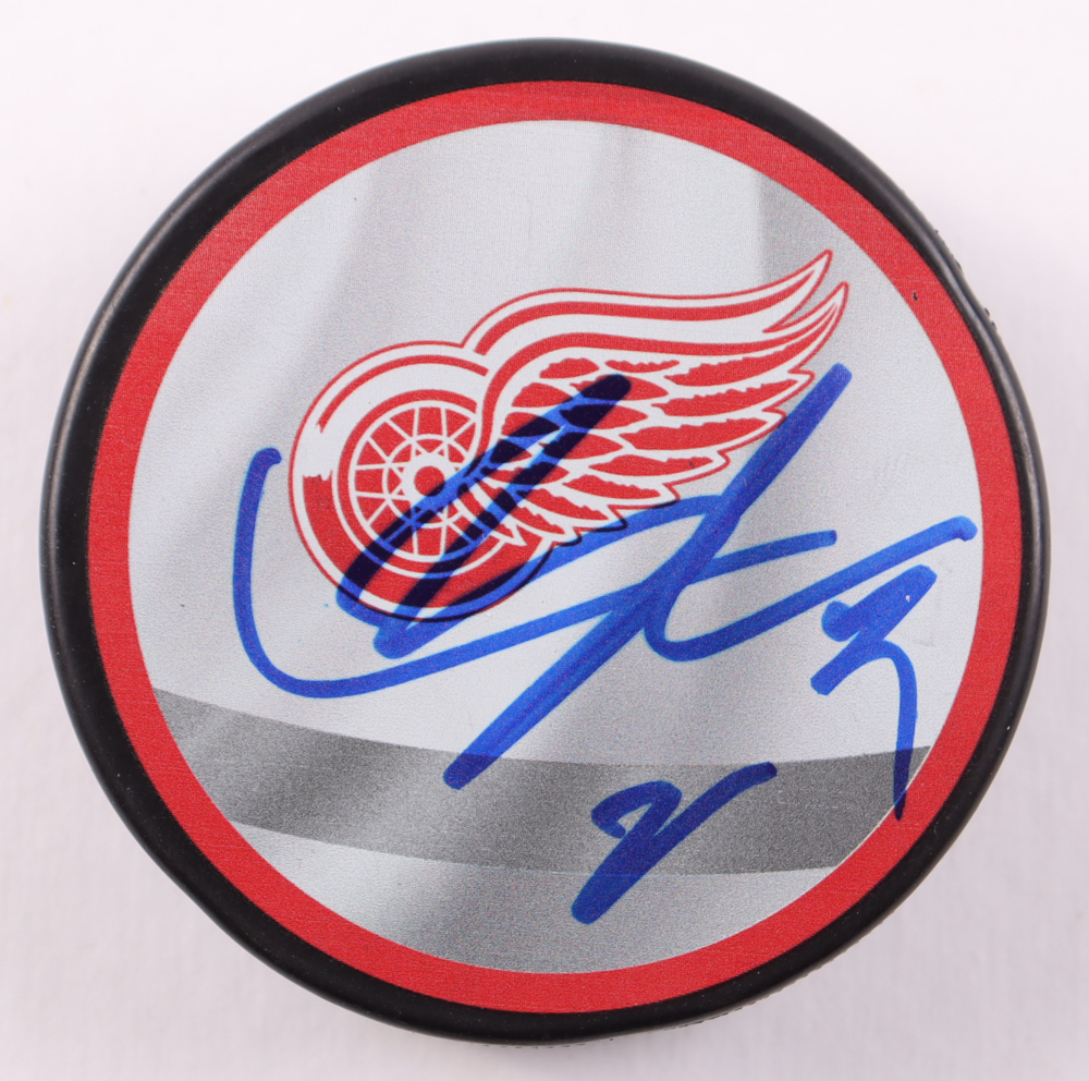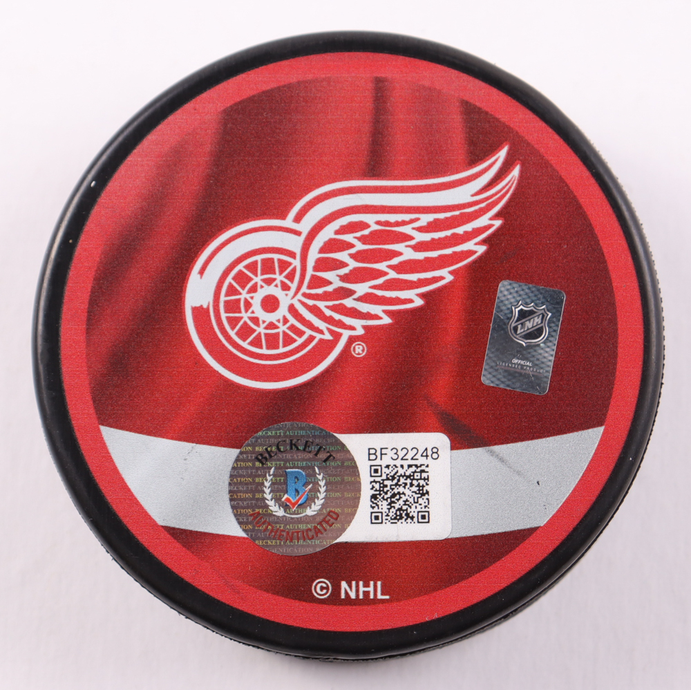 Lucas Raymond Signed Red Wings Logo Hockey Puck (Beckett)