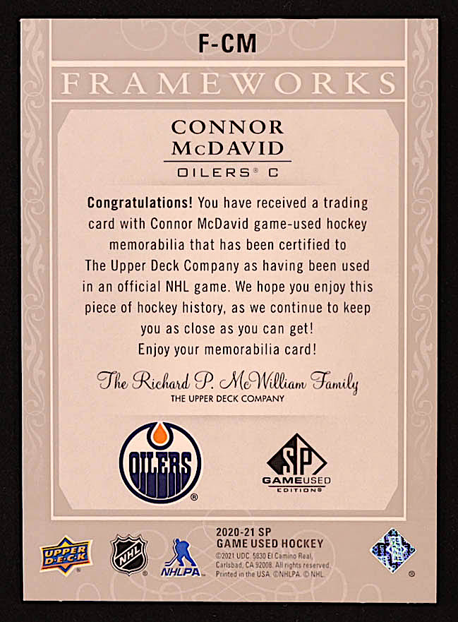 Connor McDavid 2020-21 SP Game Used Frameworks Materials #FCM