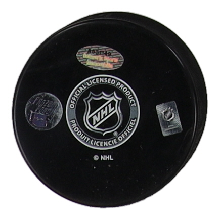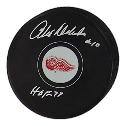 Detroit Red Wings logo hockey puck. Hand-signed and inscribed by Alex Delvecchio (HOF).