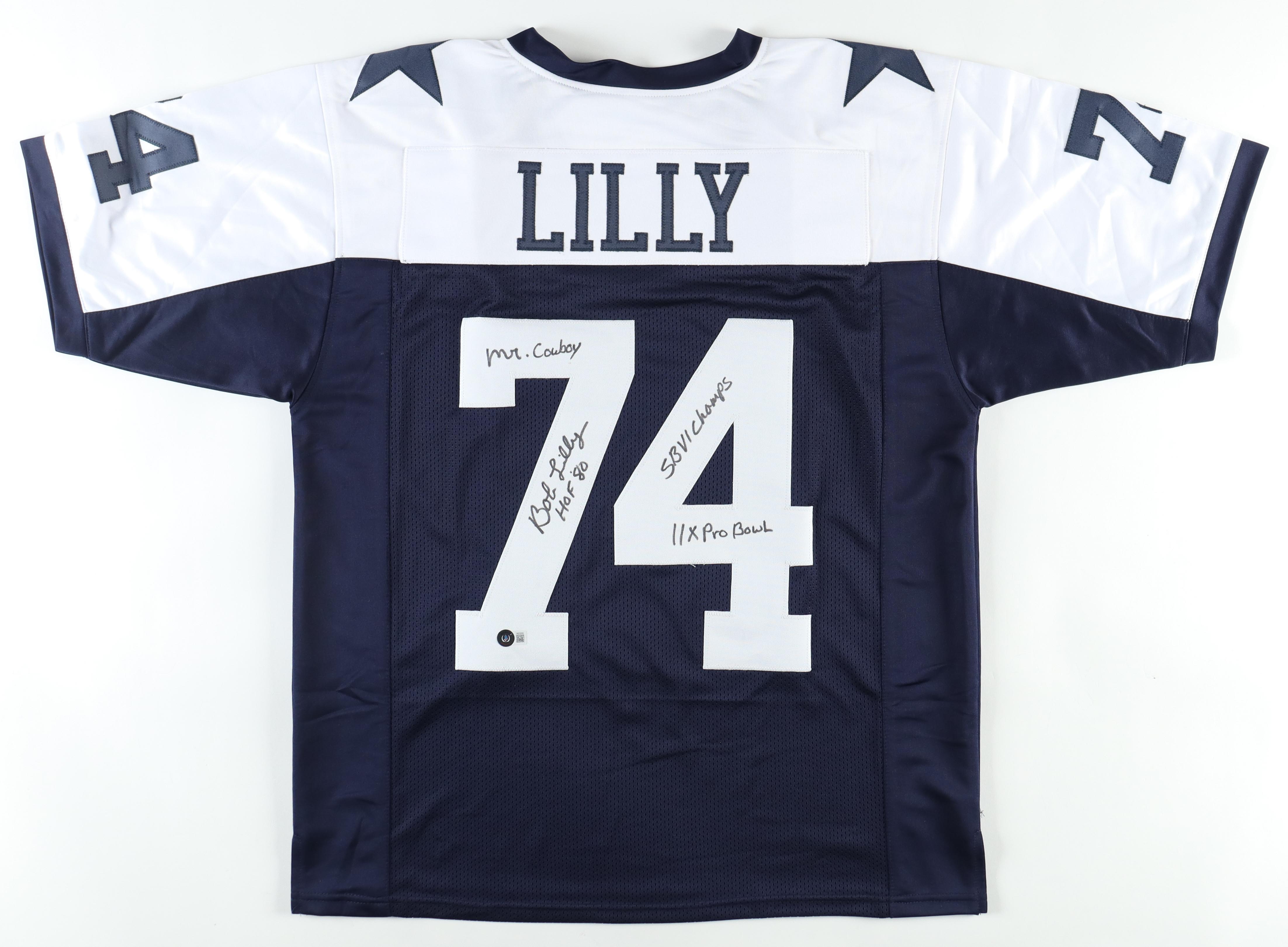 Custom jersey. Everything is sewn on, size XL. Hand-signed and inscribed by Bob Lilly (Dallas Cowboys, HOF).