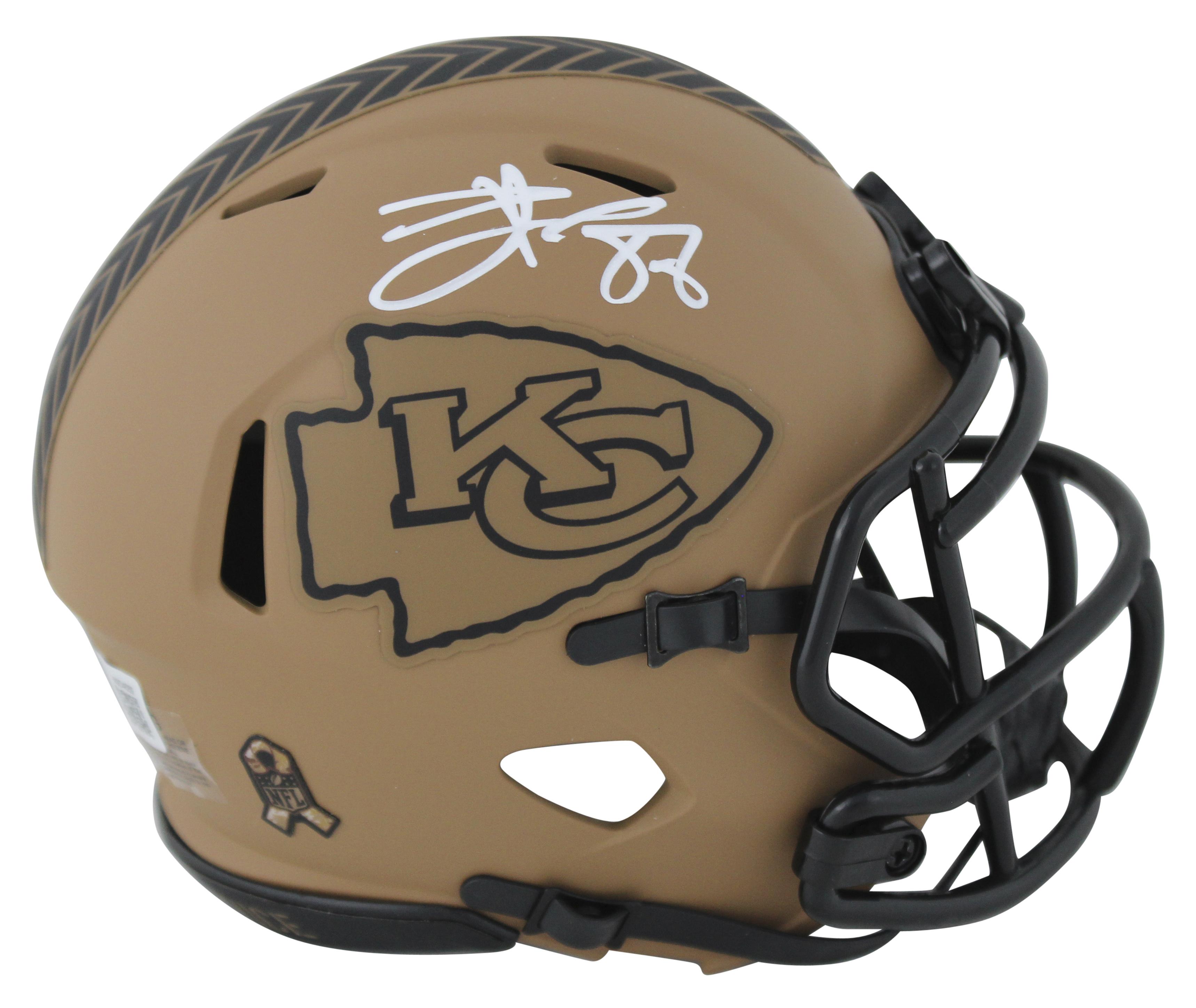 Riddell Kansas City Chiefs Salute To Service Alternate Speed Mini Helmet has been hand-signed by Travis Kelce.