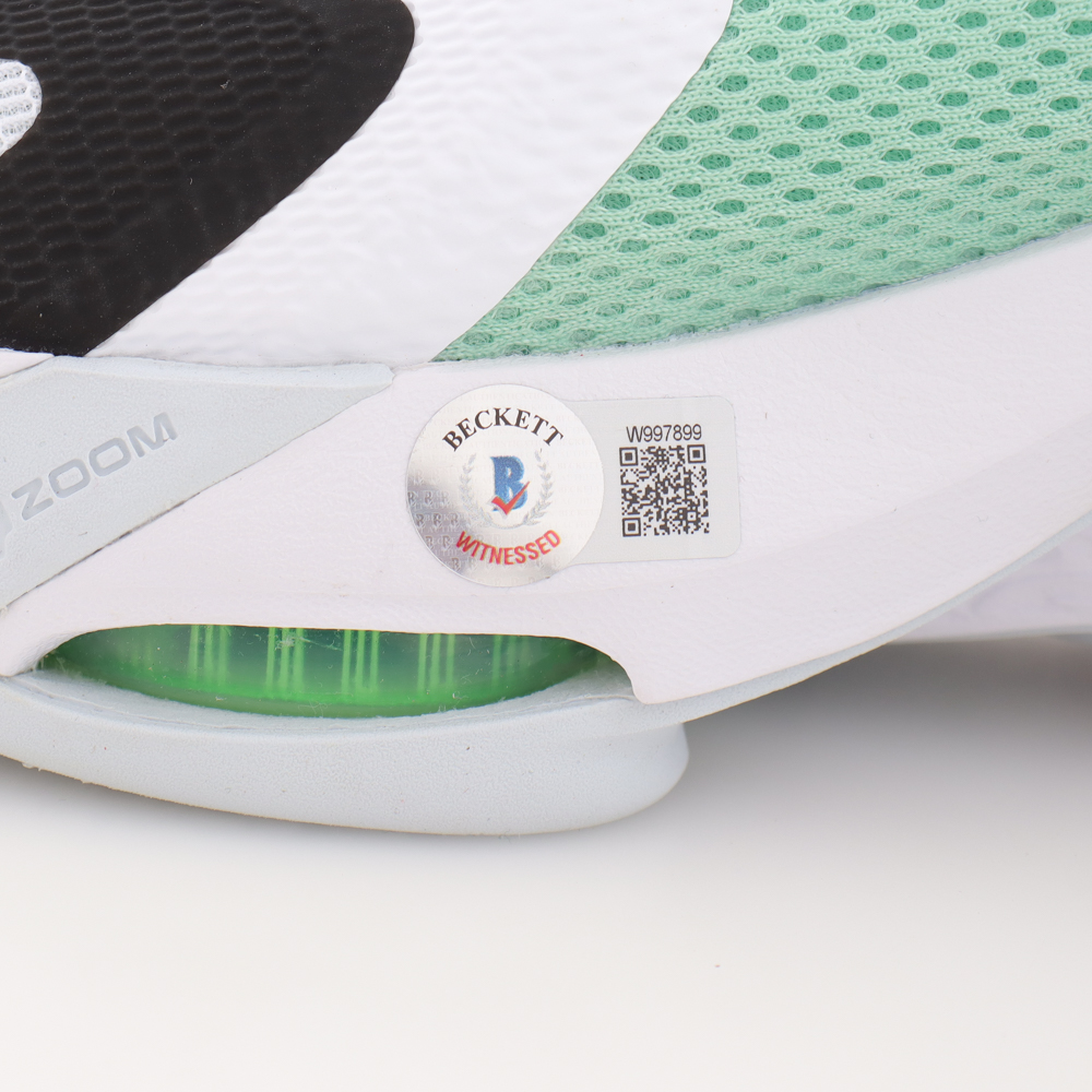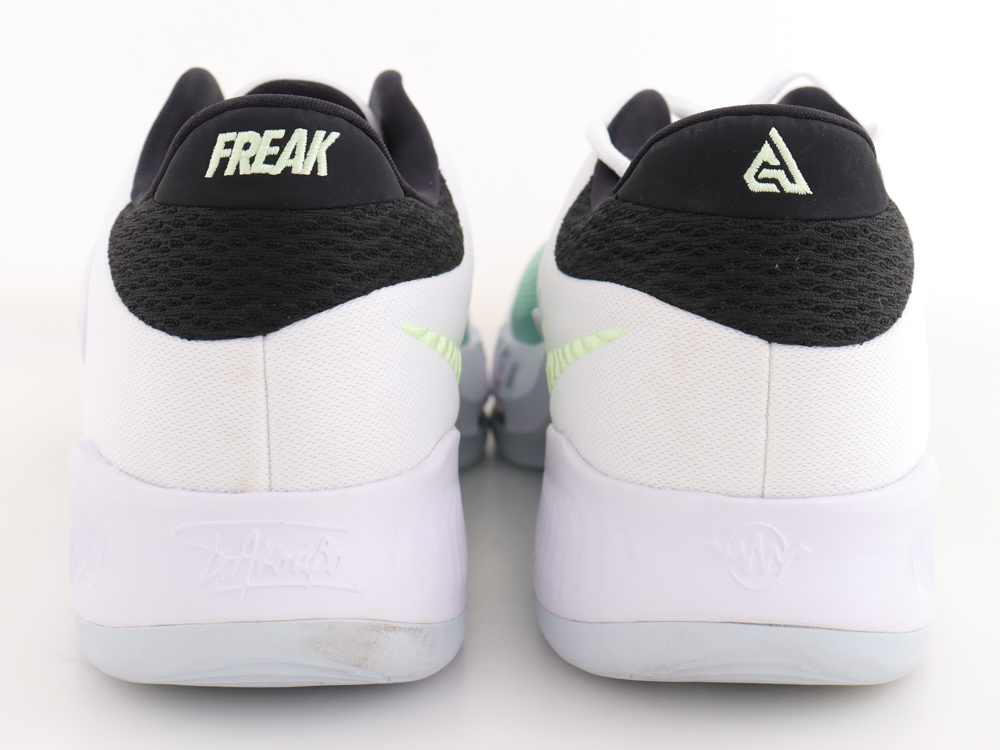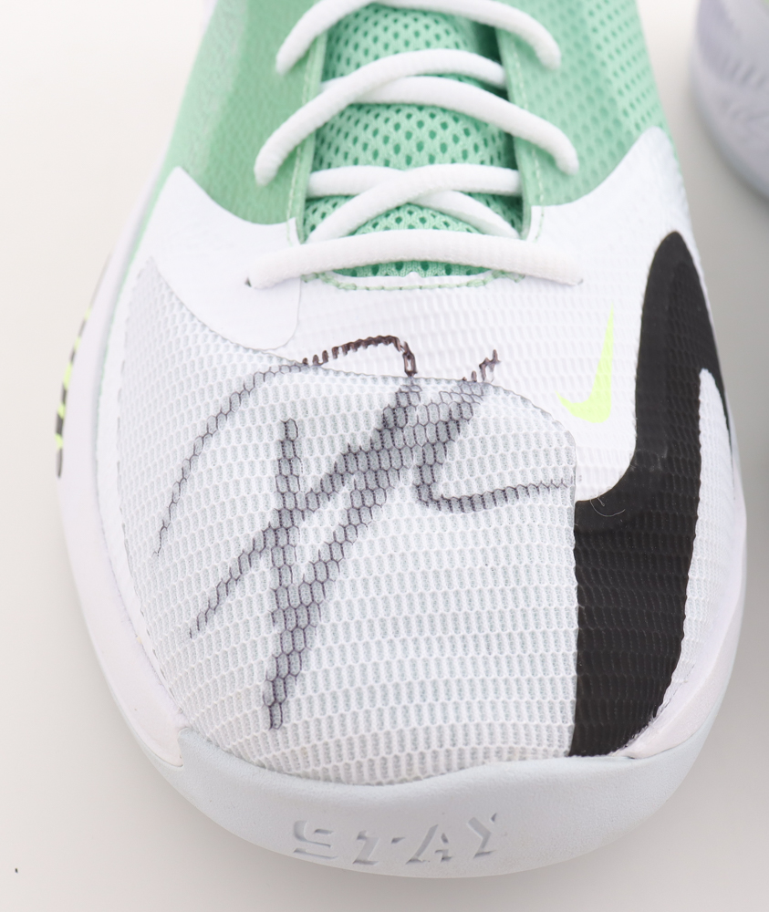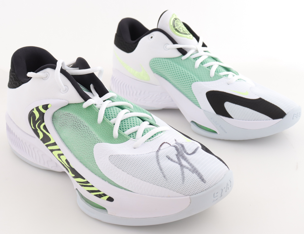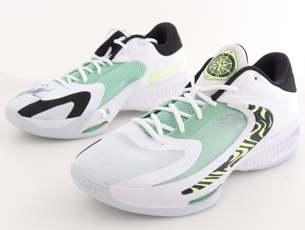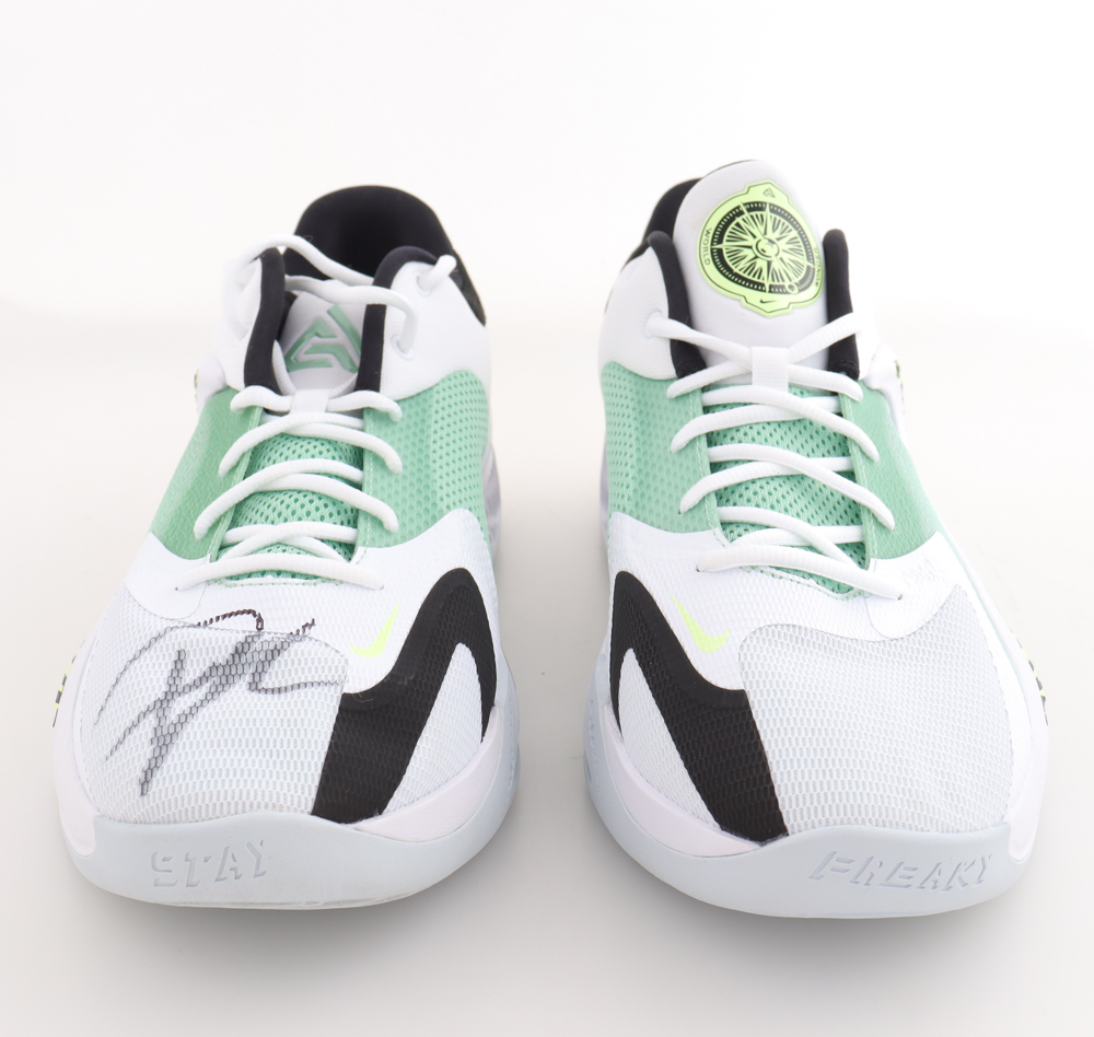 Pair of Nike Greek Freak 4 basketball shoes, size 13. The right shoe has been hand-signed by Giannis Antetokounmpo (Milwaukee Bucks).