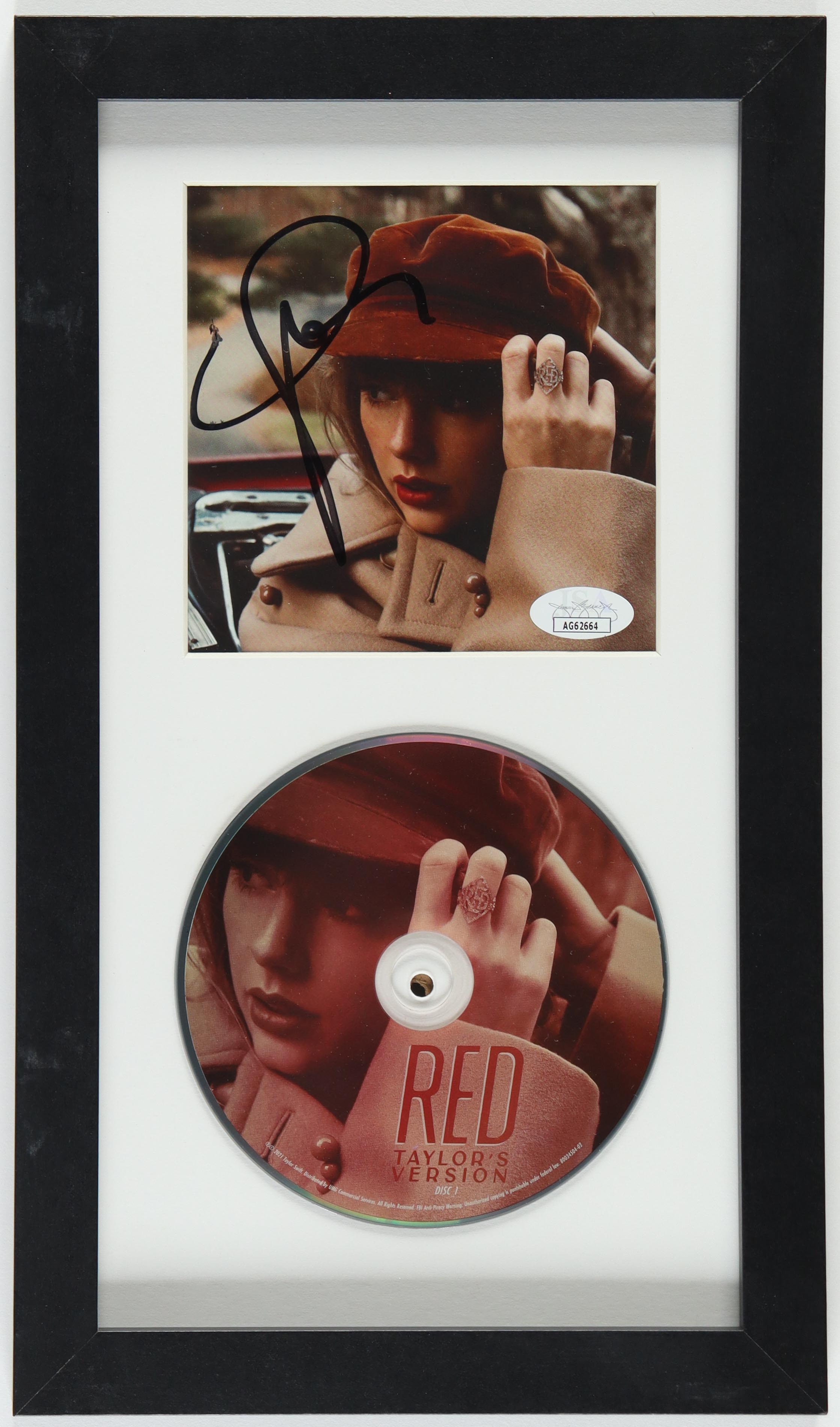 Custom frame measures 8" x 13" in size. Features a "Red: Taylor's Version" CD booklet that has been hand-signed by Taylor Swift. Display includes disc.