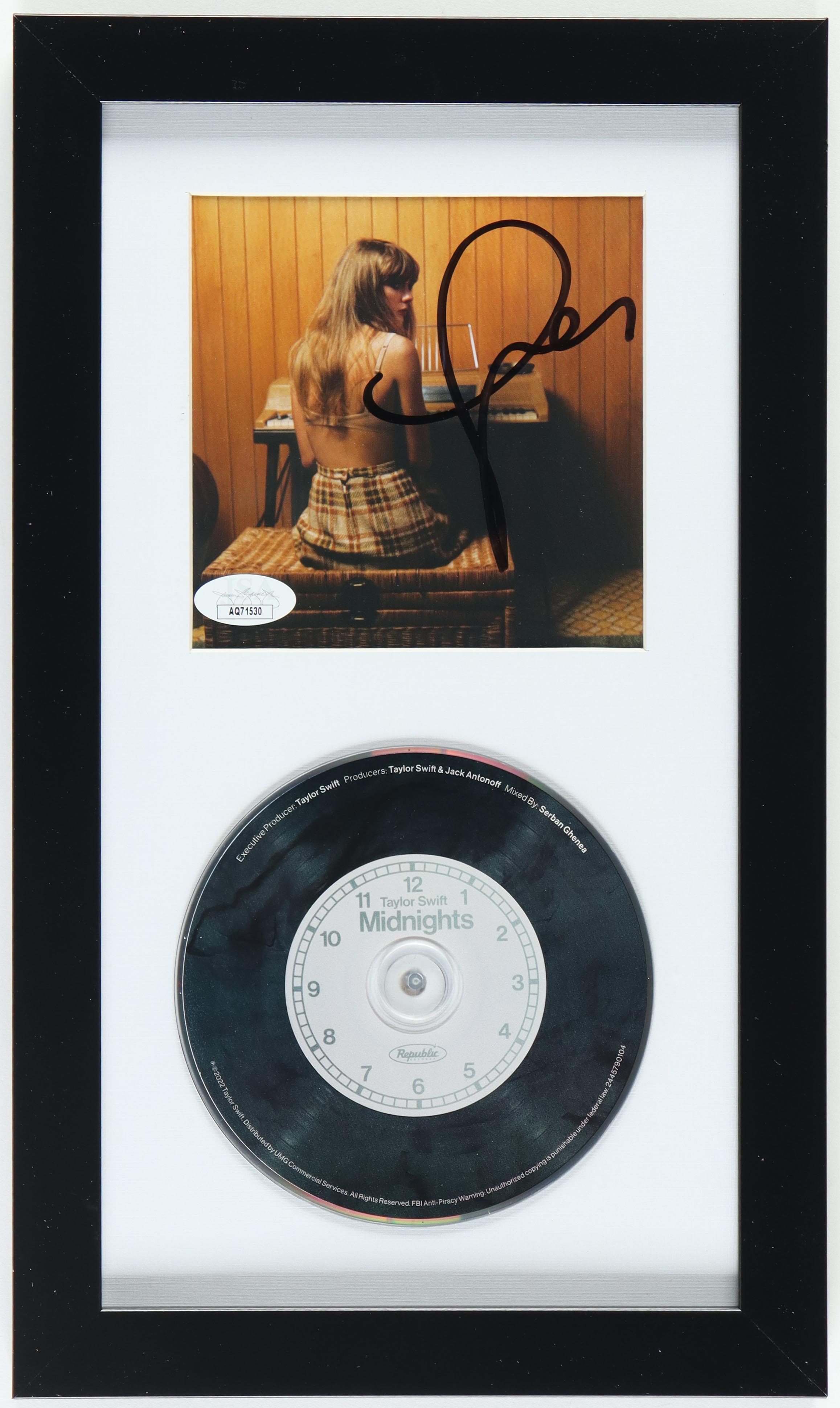 Custom frame measures 8" x 13" in size. Features a "Midnights" CD booklet that has been hand-signed by Taylor Swift. Display includes disc.