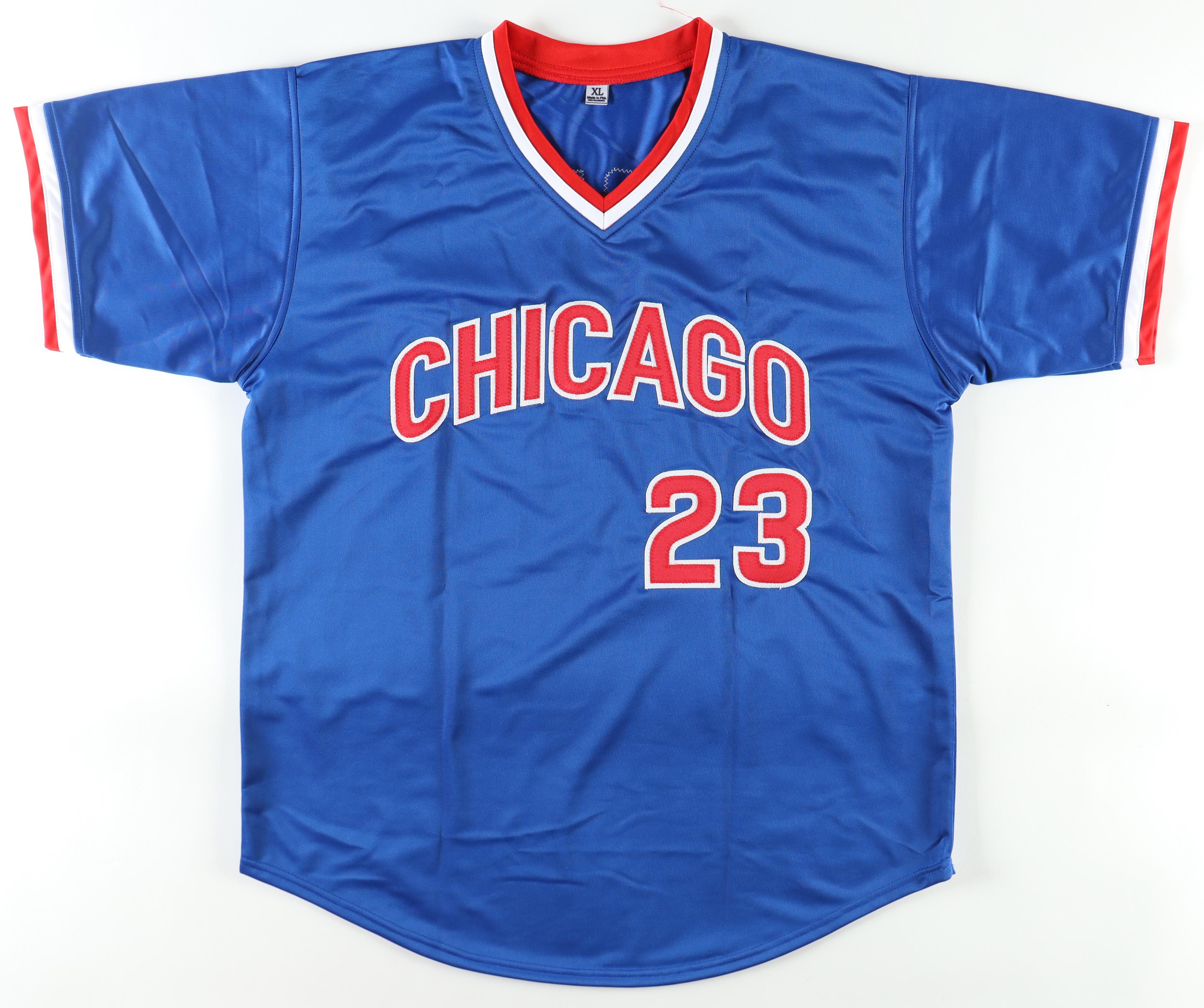 Custom jersey. Everything sewn on, size XL. Hand-signed and inscribed by Ryne Sandberg (HOF).