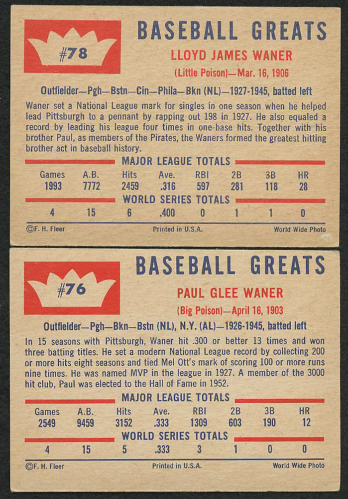 Lot of (2) 1960 Fleer Baseball Cards with #76 Paul Waner & #78 Lloyd Waner