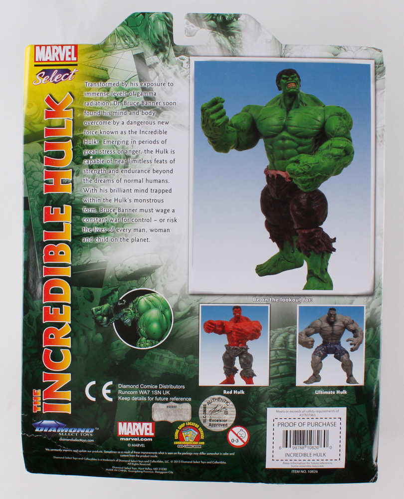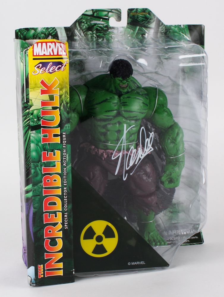 "The Incredible Hulk" Marvel Select Action Figure. Action figure measures approximately 9" tall. Packaging has been hand-signed in white paint pen by Stan Lee.