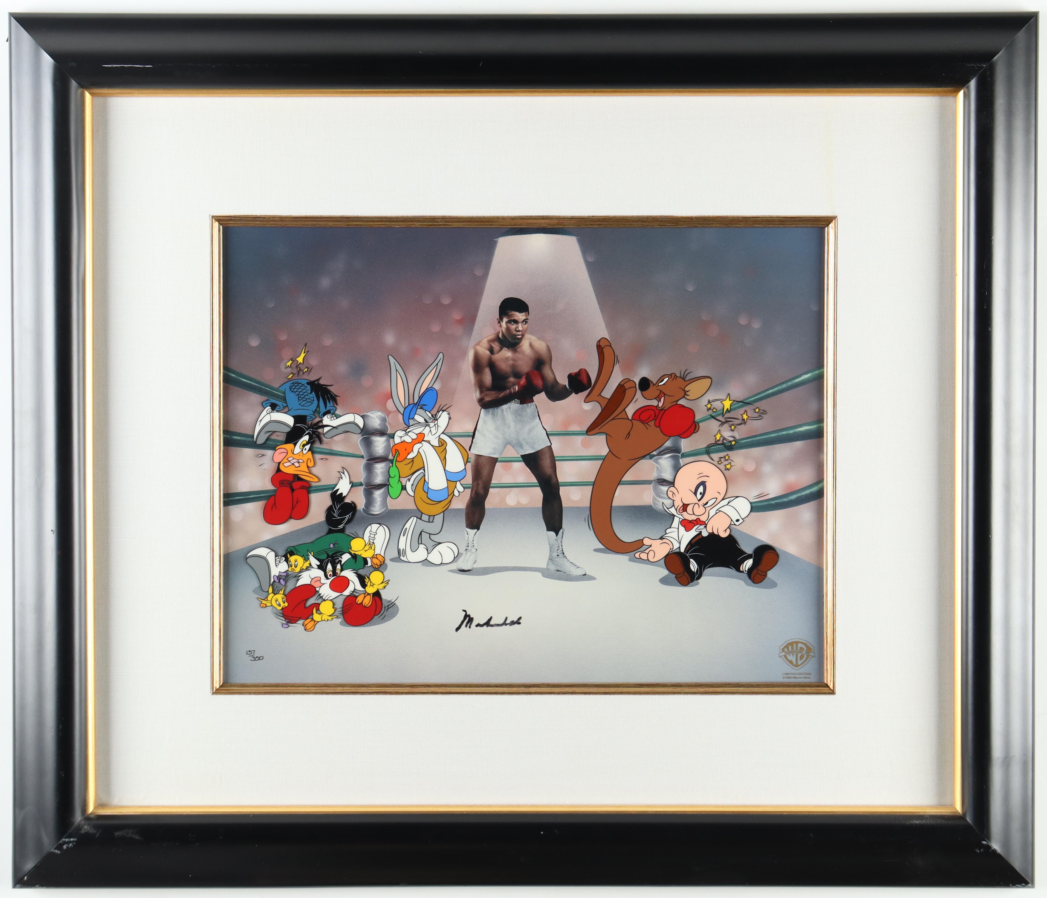 1996 Warner Brothers animation art bearing the official seal of authentication from Warner Bros. measures approximately 24" x 28" in dimension. Hand-signed by Muhammad Ali (D. 2016, HOF). The display is limited edition and has been numbered #137/350. Please note, there is scuffing and scratches and chips on the frame border.