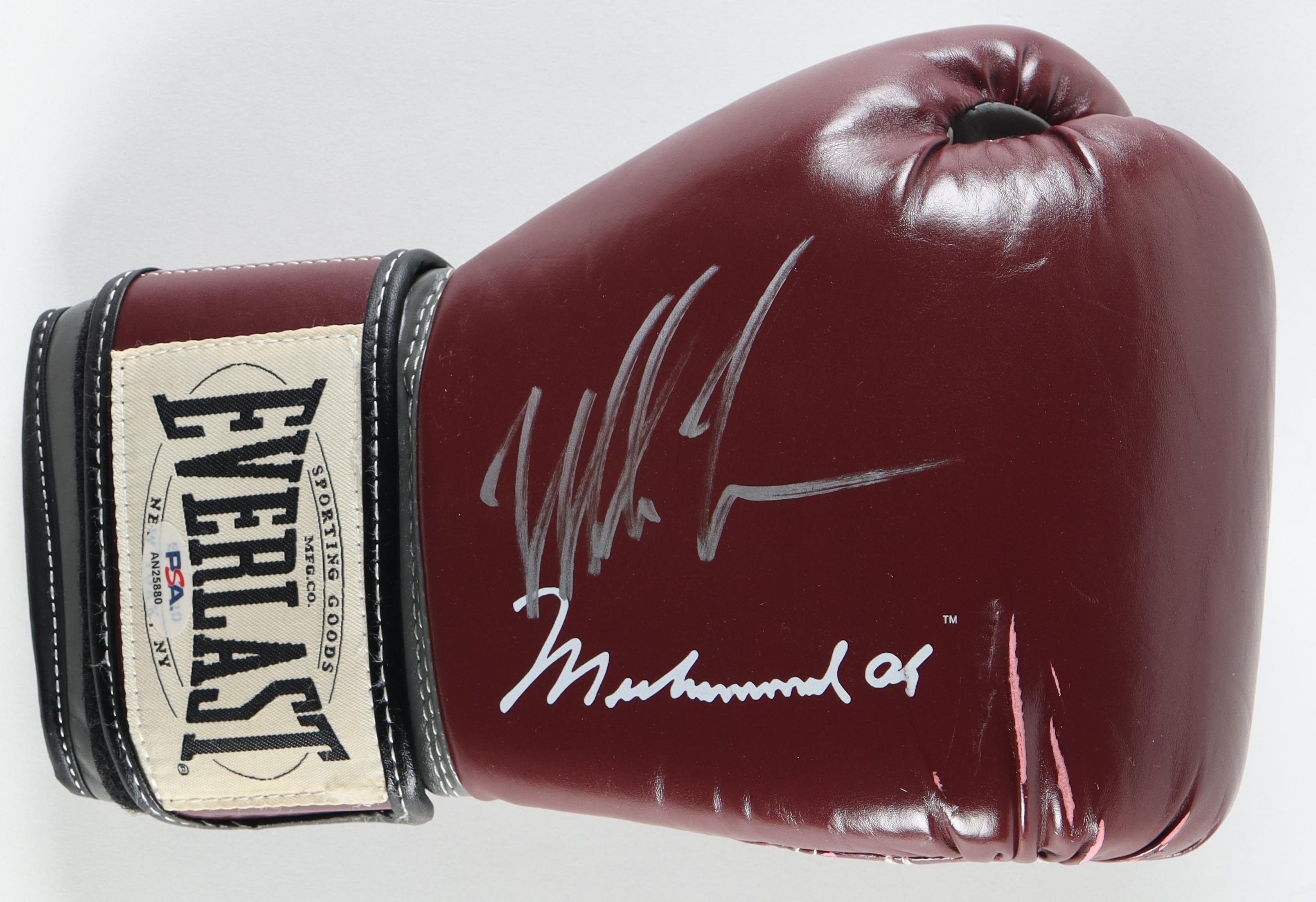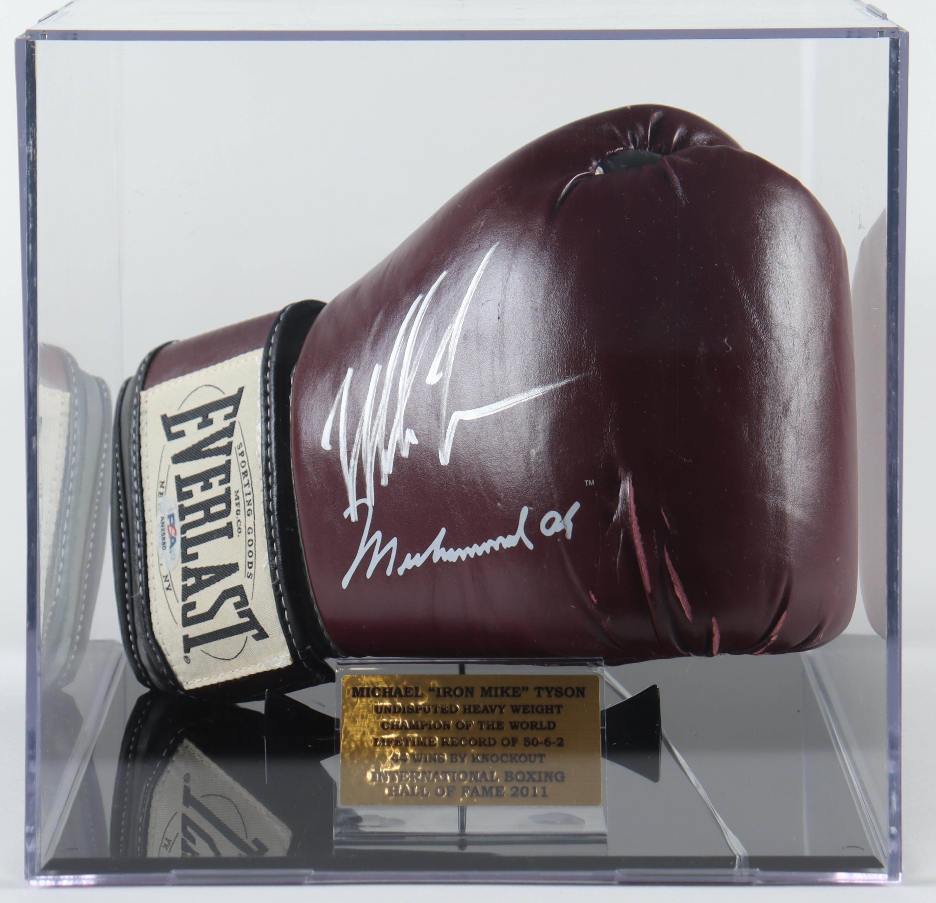 Everlast Muhammad Ali Model boxing glove. The glove has been hand-signed by Mike Tyson (HOF). The display case is included as shown. Please note, the Ali signature is a facsimile and the display case corner is cracked.