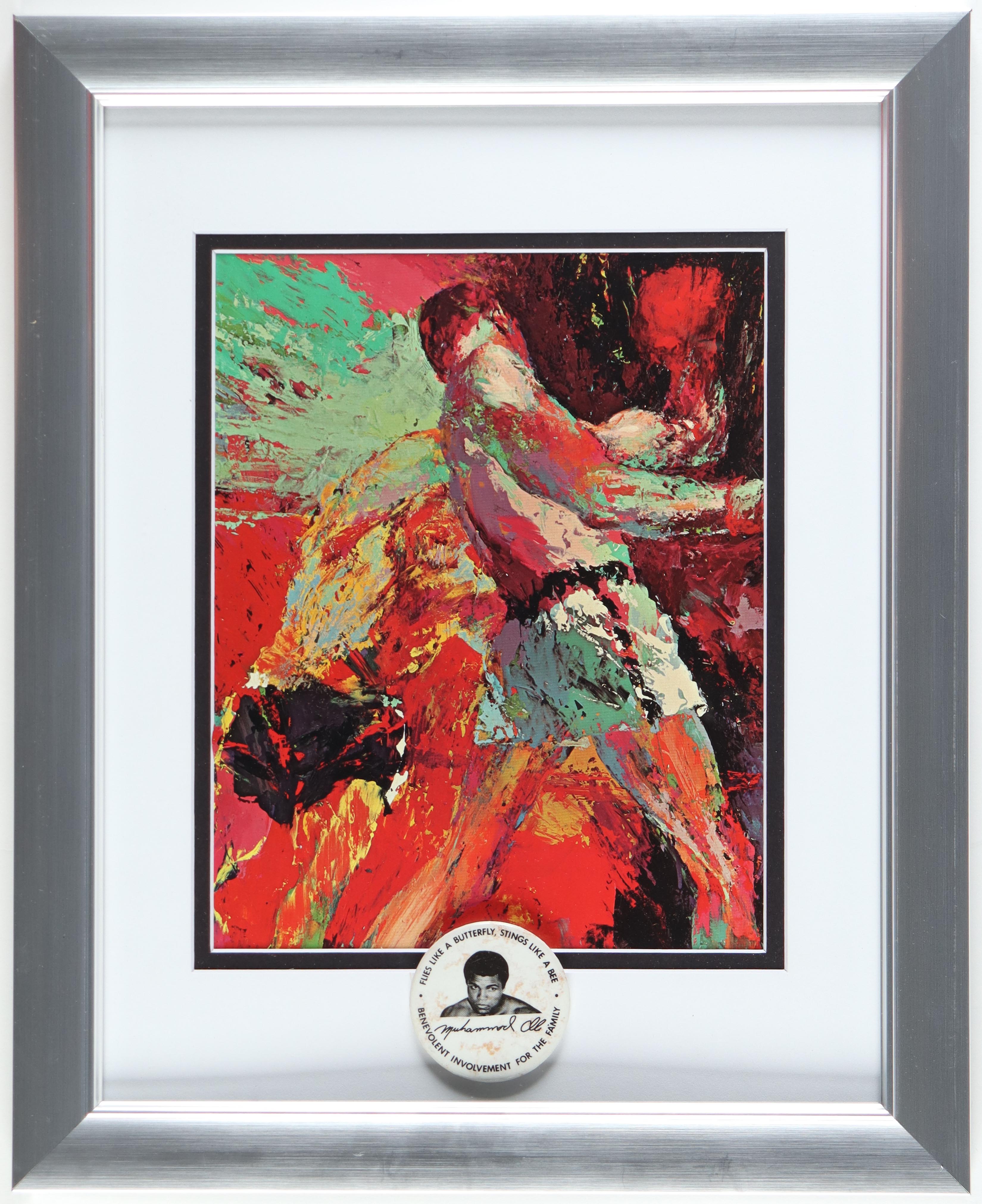 Muhammad Ali Custom Framed Art Print Display By Leroy Neiman with 1970 Vintage "Flies Like A Butterfly Stings Like A Bee" Lapel Pin