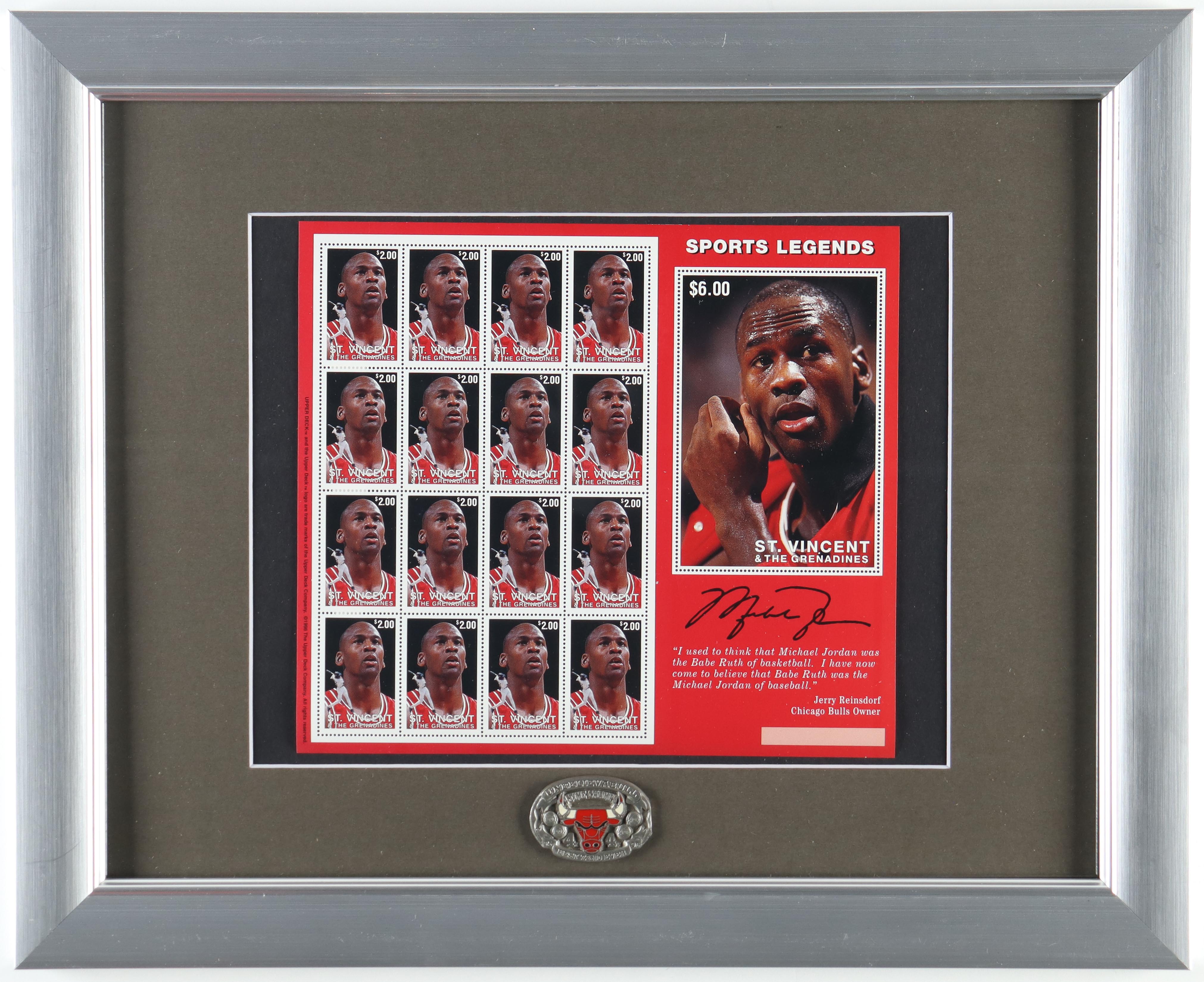Michael Jordan Bulls Uncut Postage Stamp Sheet Custom Framed Display With Metal Silver Bulls Emblem Pin