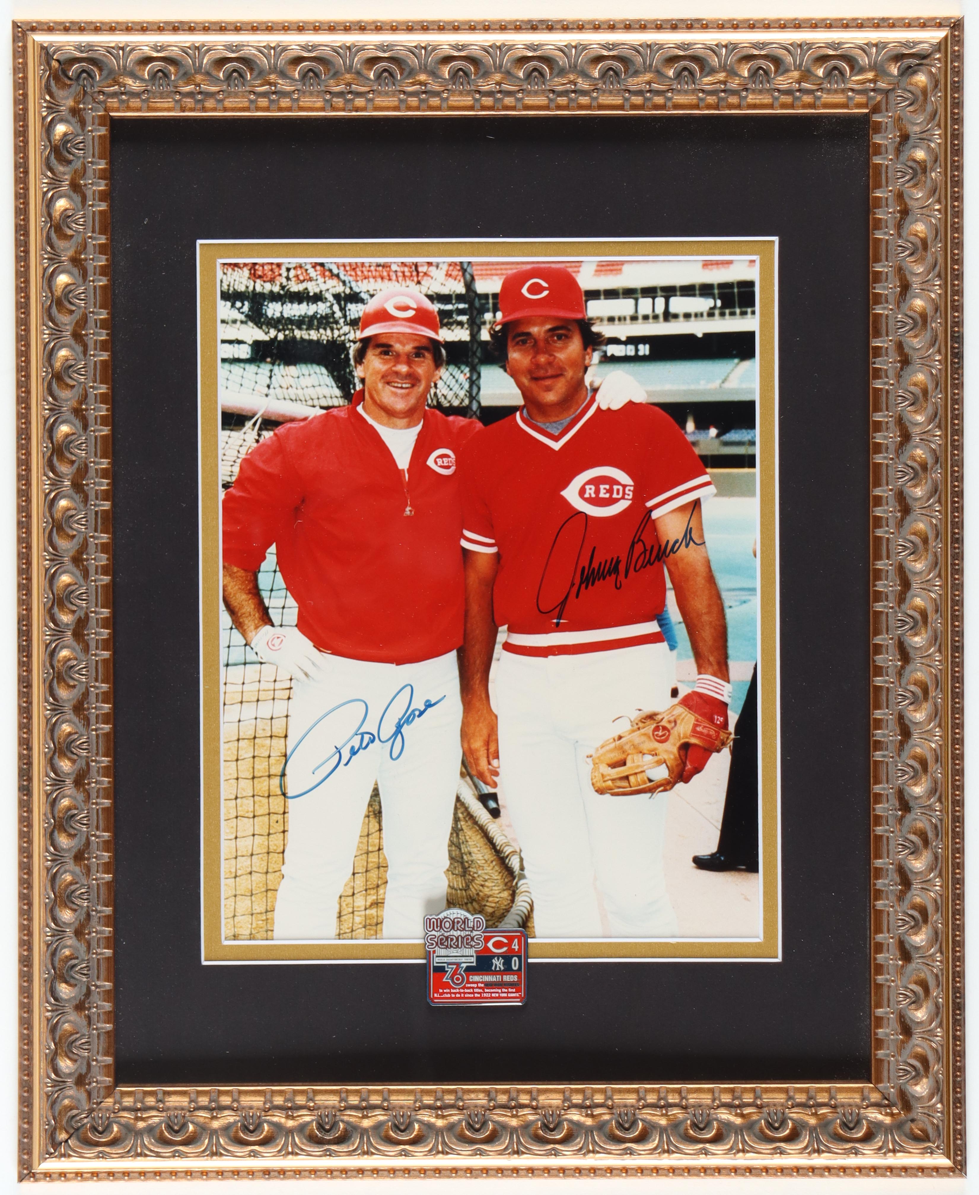 The custom framed photo display measures approximately 13.5" x 16.5" in size and features a photo that has been hand-signed by Pete Rose (Cincinnati Reds) and Johnny Bench (Cincinnati Reds, HOF). Display also features an original 1976 world series pin.