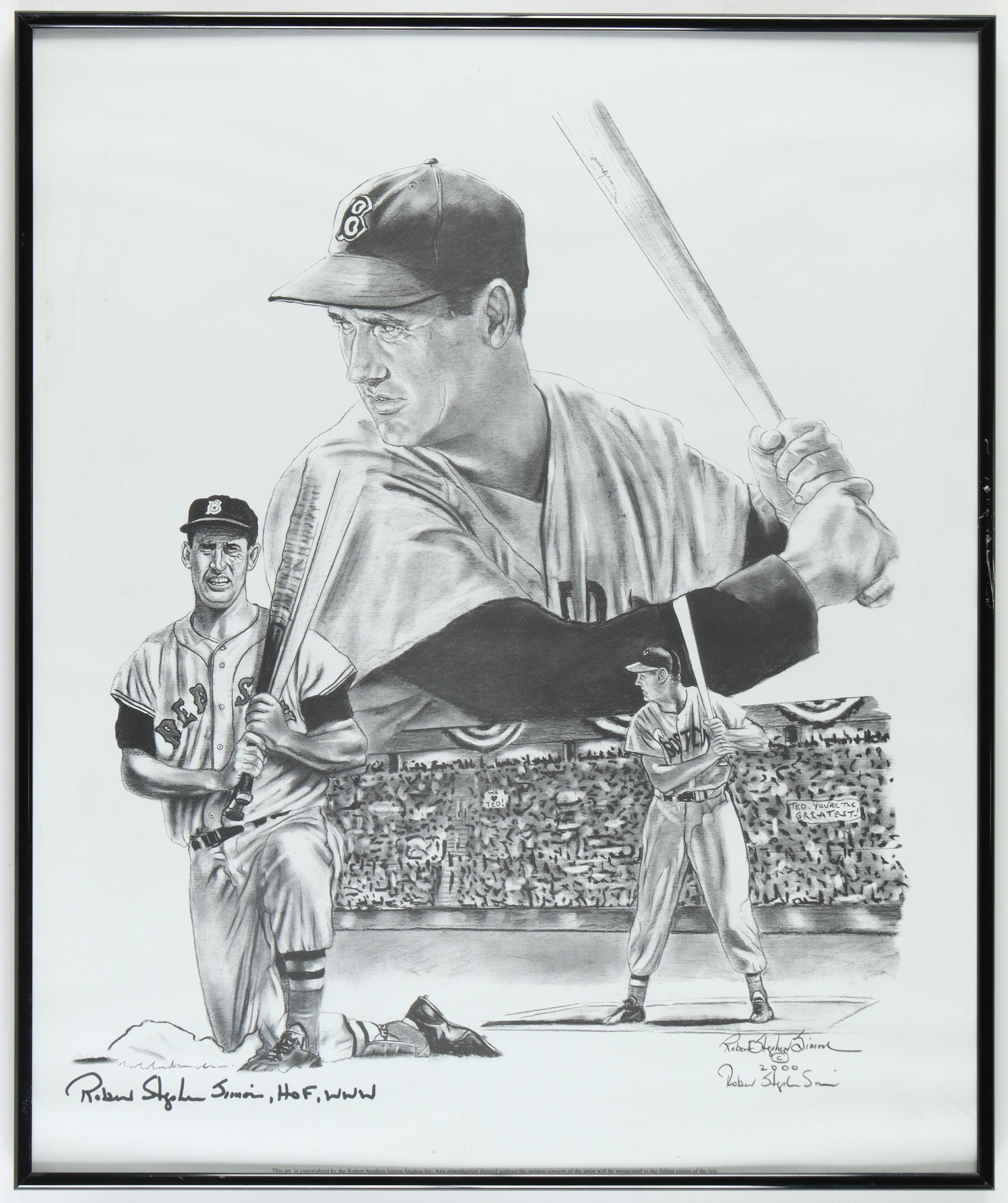 Custom frame measures 20" x 26" in size and features a custom print that features Ted Williams (D. 2002, Boston Red Sox, HOF) and the artist Robert Stephen Simon.