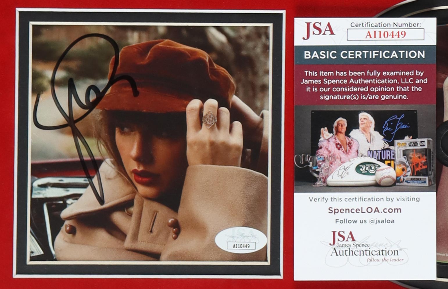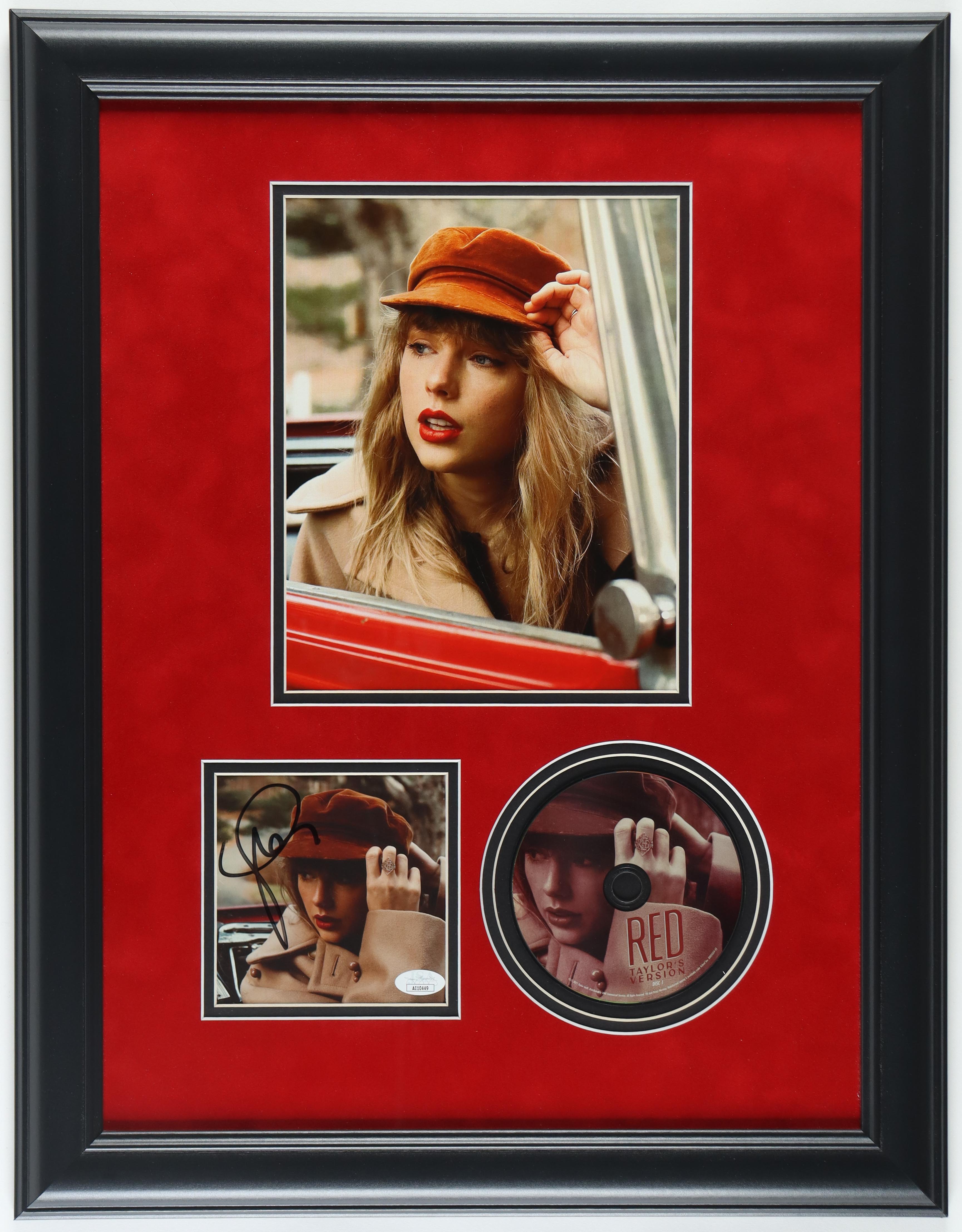 Custom frame measures approximately 18.5" x 24" in size. Features a "Red: Taylor's Version" CD album insert that has been hand-signed by Taylor Swift. The CD disc is included as shown. Please note, there are small scratches on the frame border.
