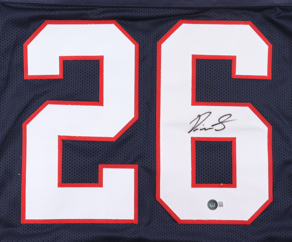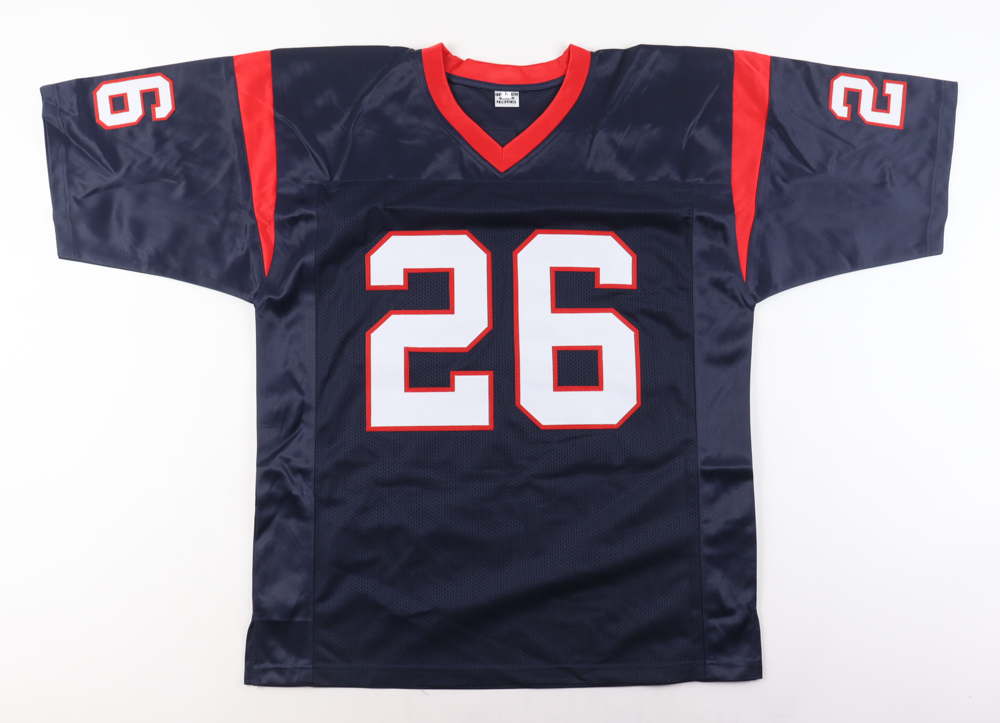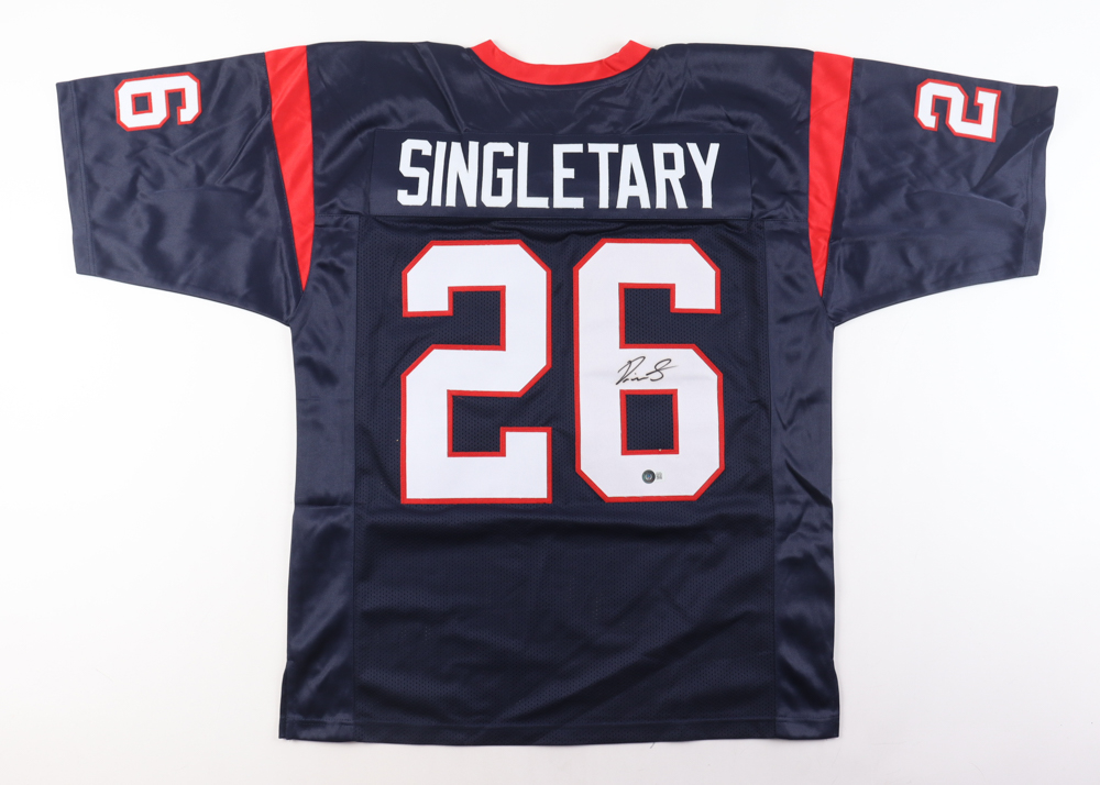 Custom jersey with everything sewn on, size L. Hand-signed by Devin Singletary.