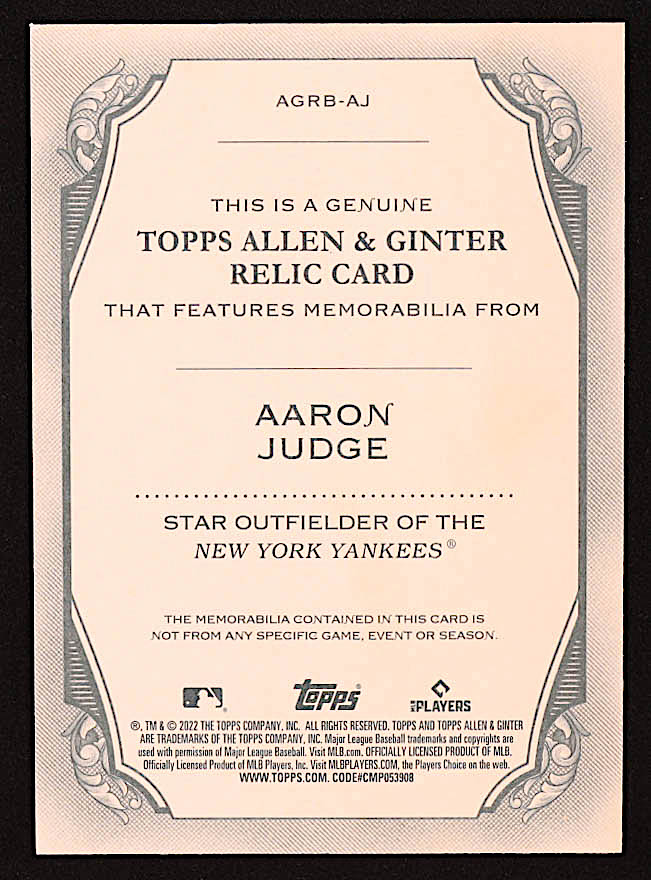 Aaron Judge 2022 Topps Allen and Ginter Relics #AGRBAJ