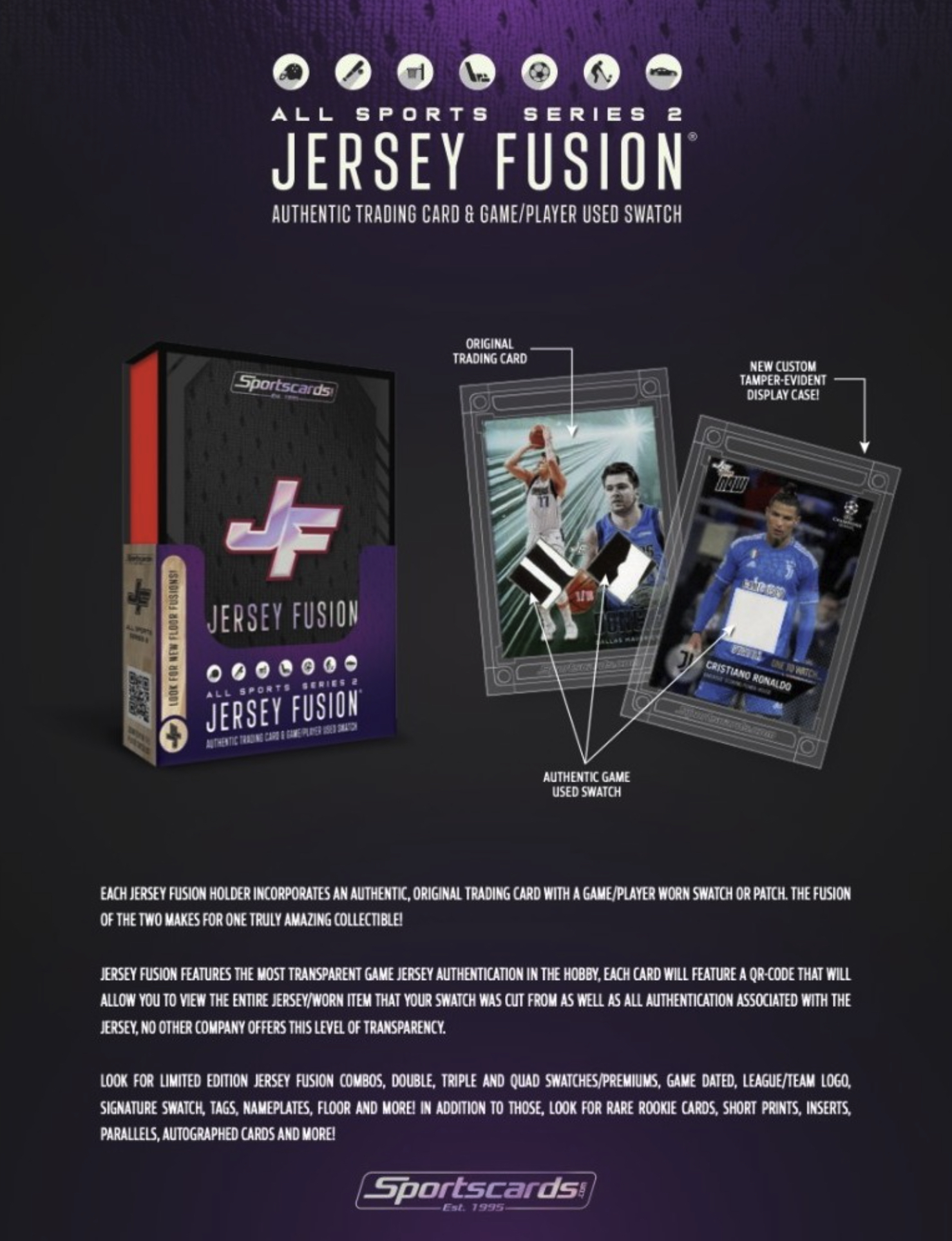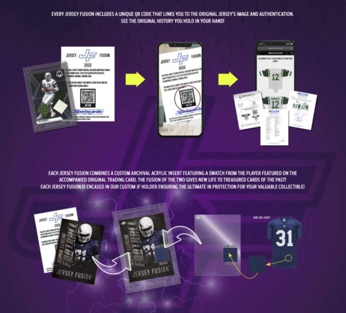 Jersey Fusion features the most transparent game jersey authentication in the hobby, each card will feature a QR-code that will allow you to view the entire jersey/worn item that your swatch was cut from as well as all authentication associated with the jersey, no other company offers this level of transparency.