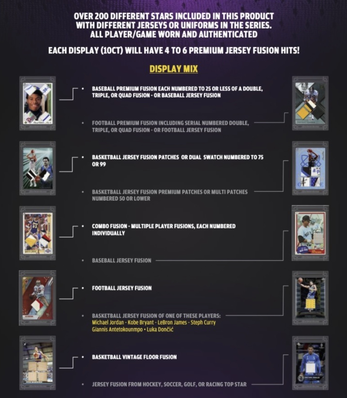 Each Jersey Fusion holder incorporates an authentic, original trading card with a game/player worn swatch or patch. The fusion of the two makes for one truly amazing collectible!