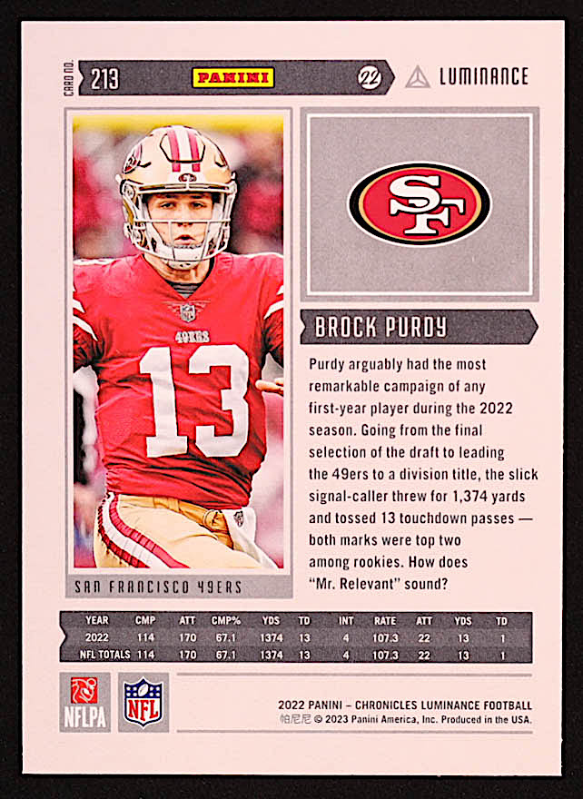 Brock Purdy 2022 Panini Chronicles Luminance Update Vertical Rookies #213 RC