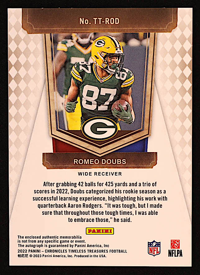 Romeo Doubs 2022 Panini Chronicles Timeless Treasures Jersey Autographs #17 RC #71/99