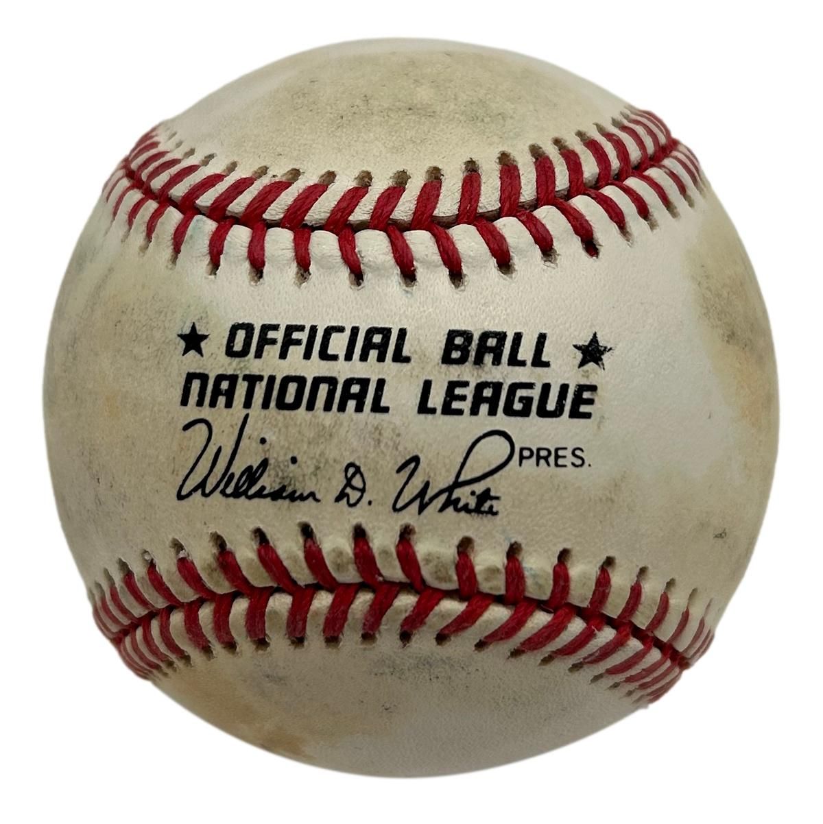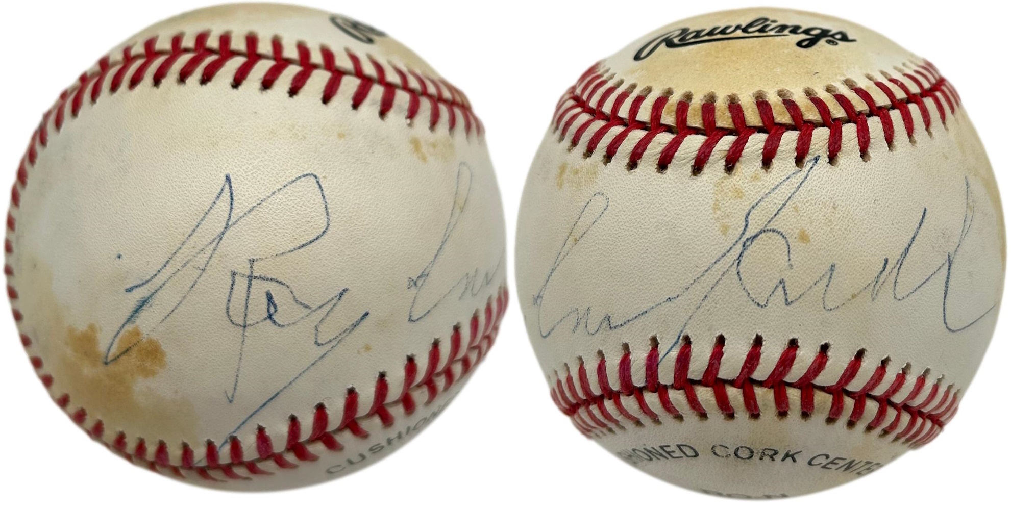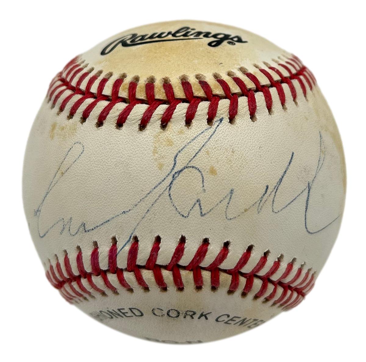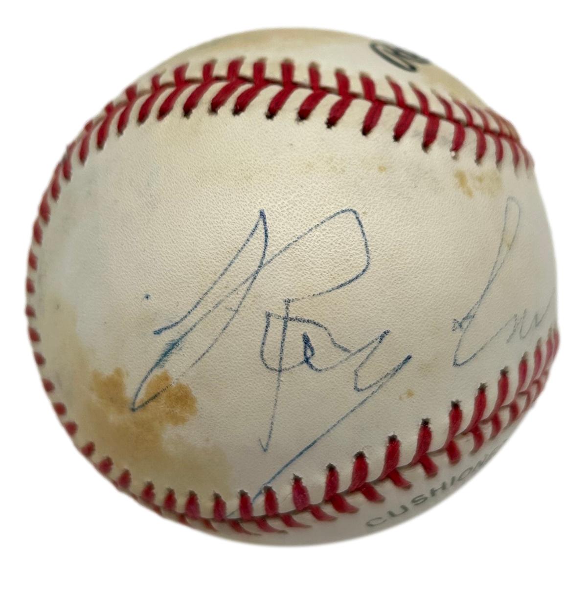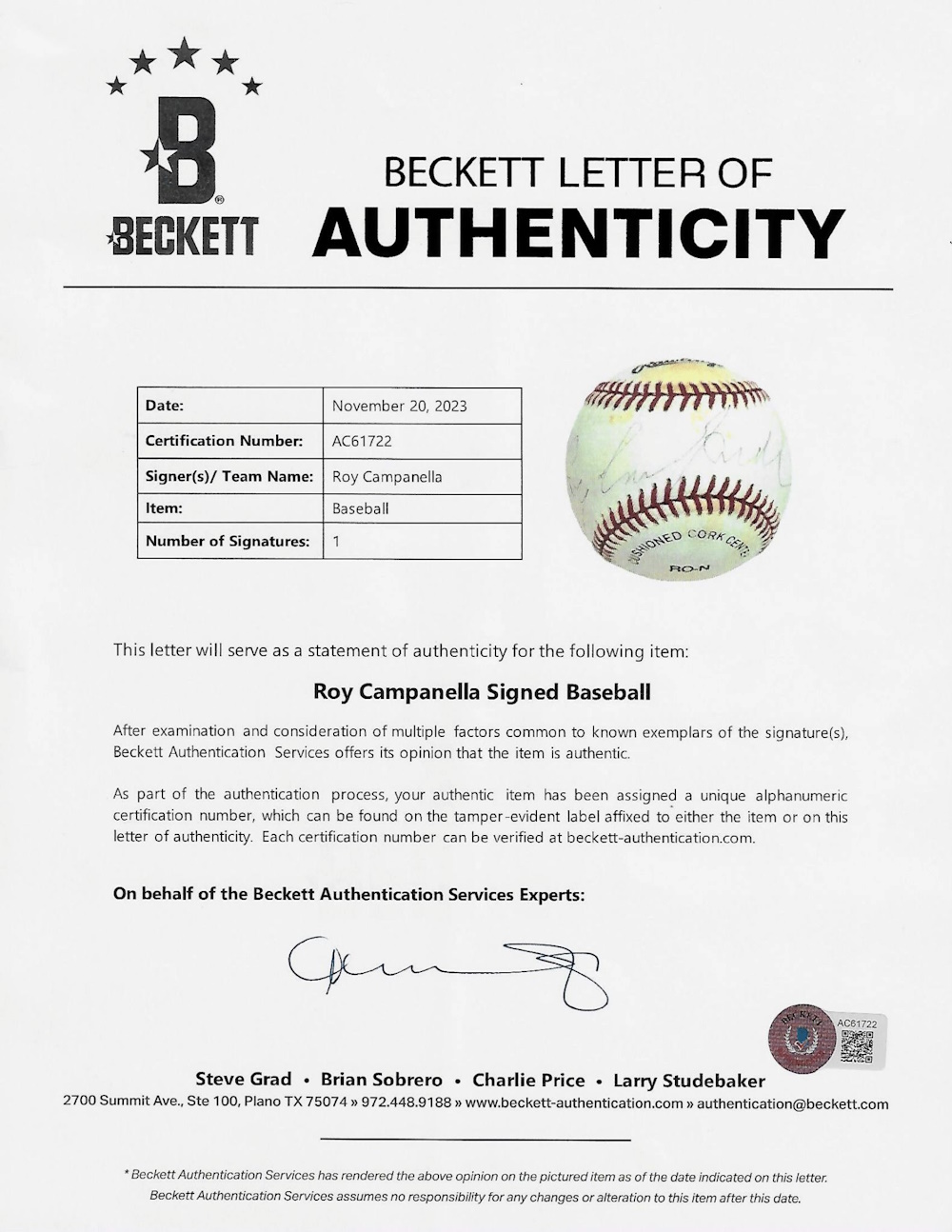 Rawlings Official National League Baseball. Hand-signed by Roy Campanella (D. 1993, Los Angeles Dodgers, HOF). Please note the ball is stained and shows many signs of aging.