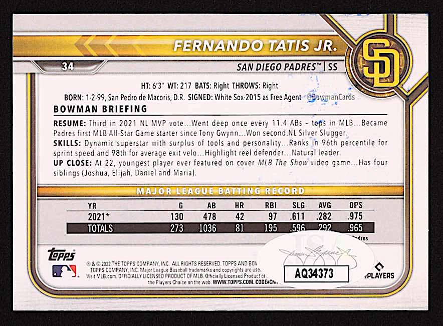 Fernando Tatis Jr. Signed 2022 Bowman #34 (JSA)