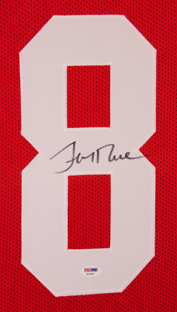 Custom frame measures approximately 35" x 43" in size and features a jersey which has been hand-signed in black felt tip pen by Jerry Rice (HOF).