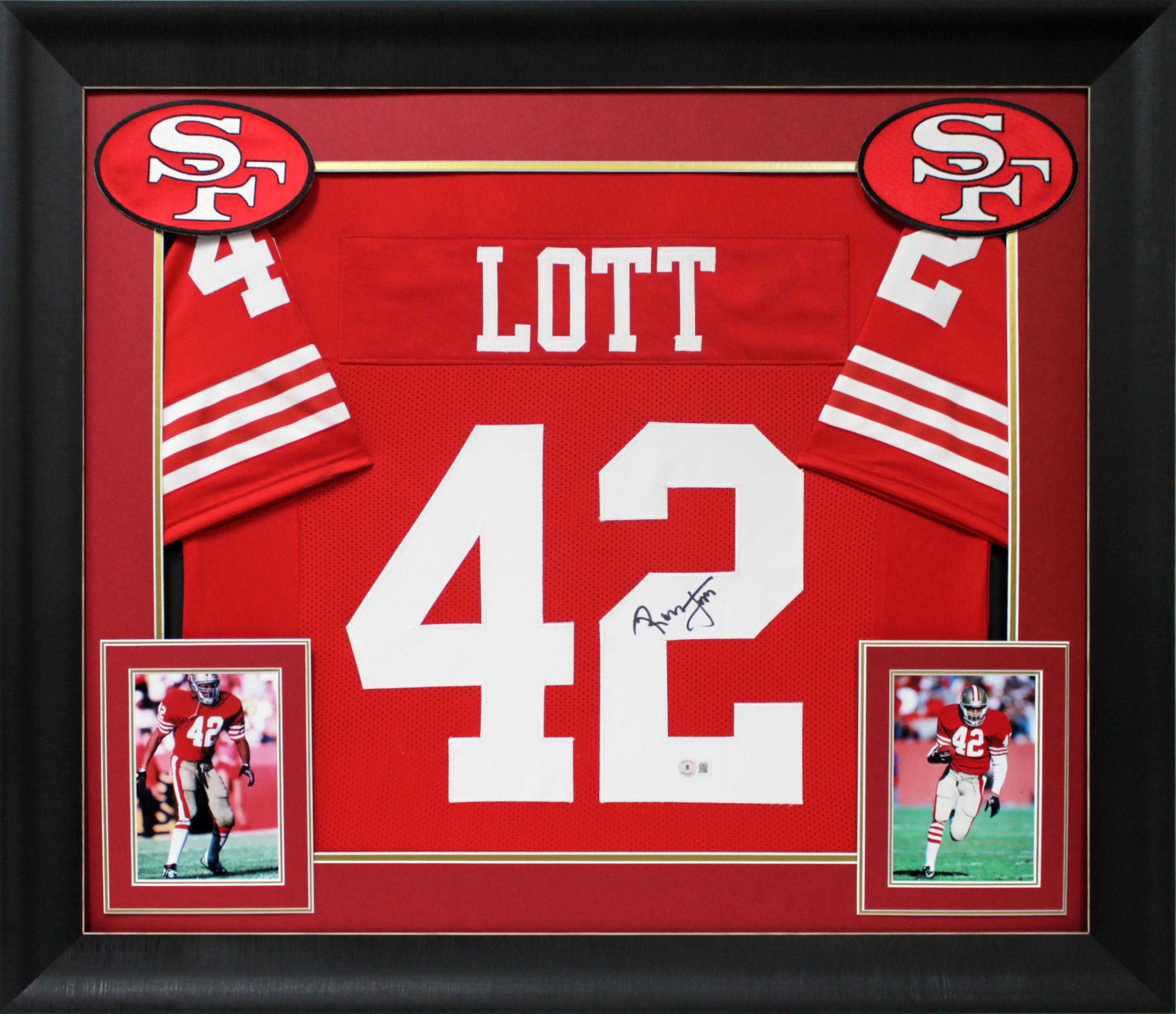 Custom frame measures approximately 32" x 37" in size and features a jersey that has been hand-signed by Ronnie Lott (HOF).