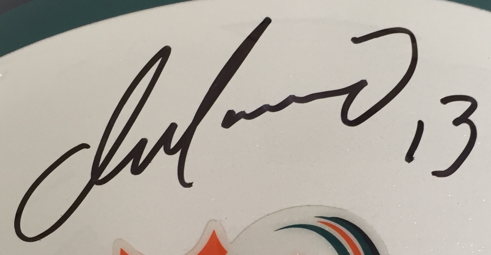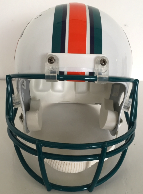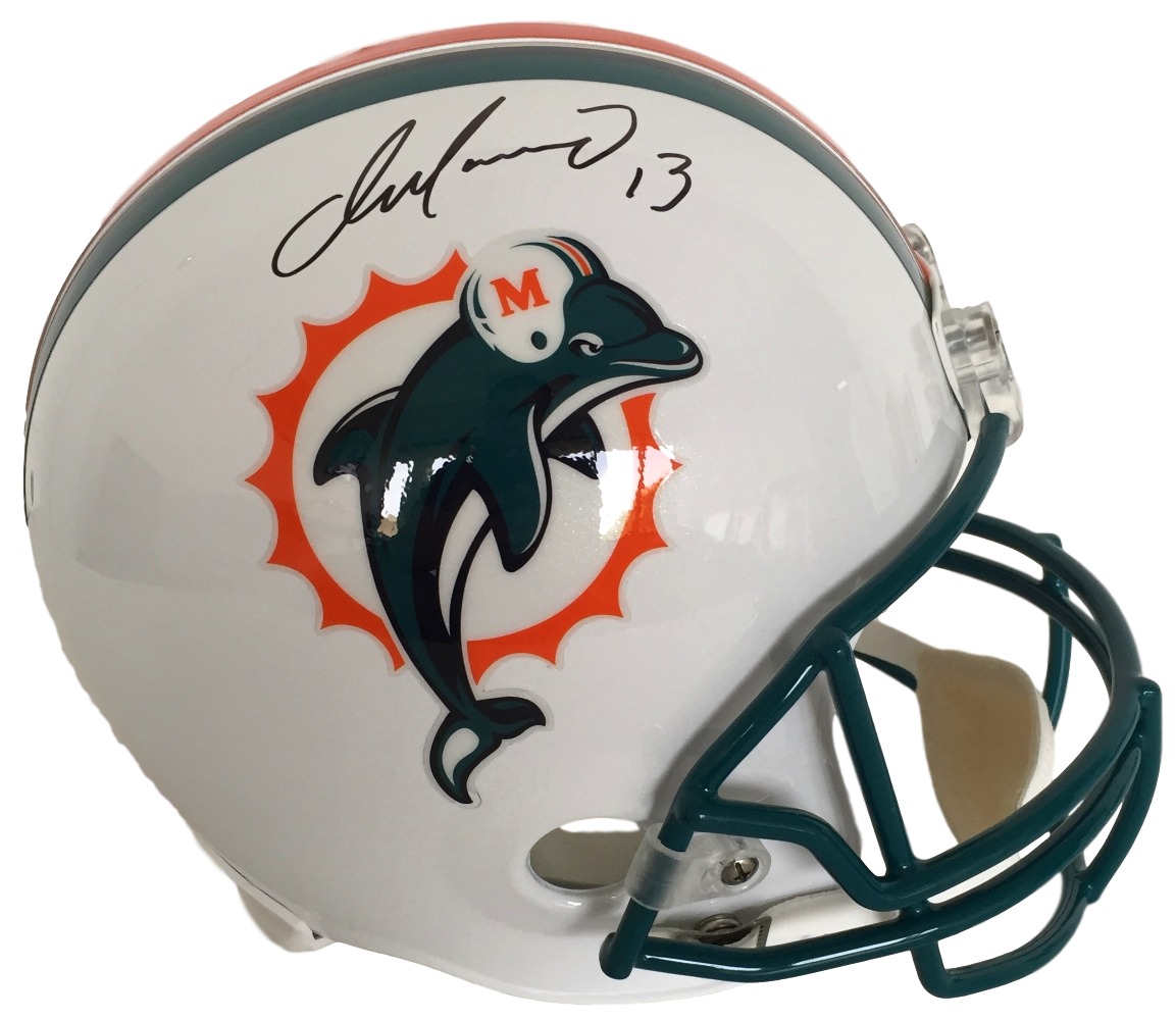 Miami Dolphins full-size replica helmet. Hand-signed in black felt-tip pen by Dan Marino (HOF, Dolphins).