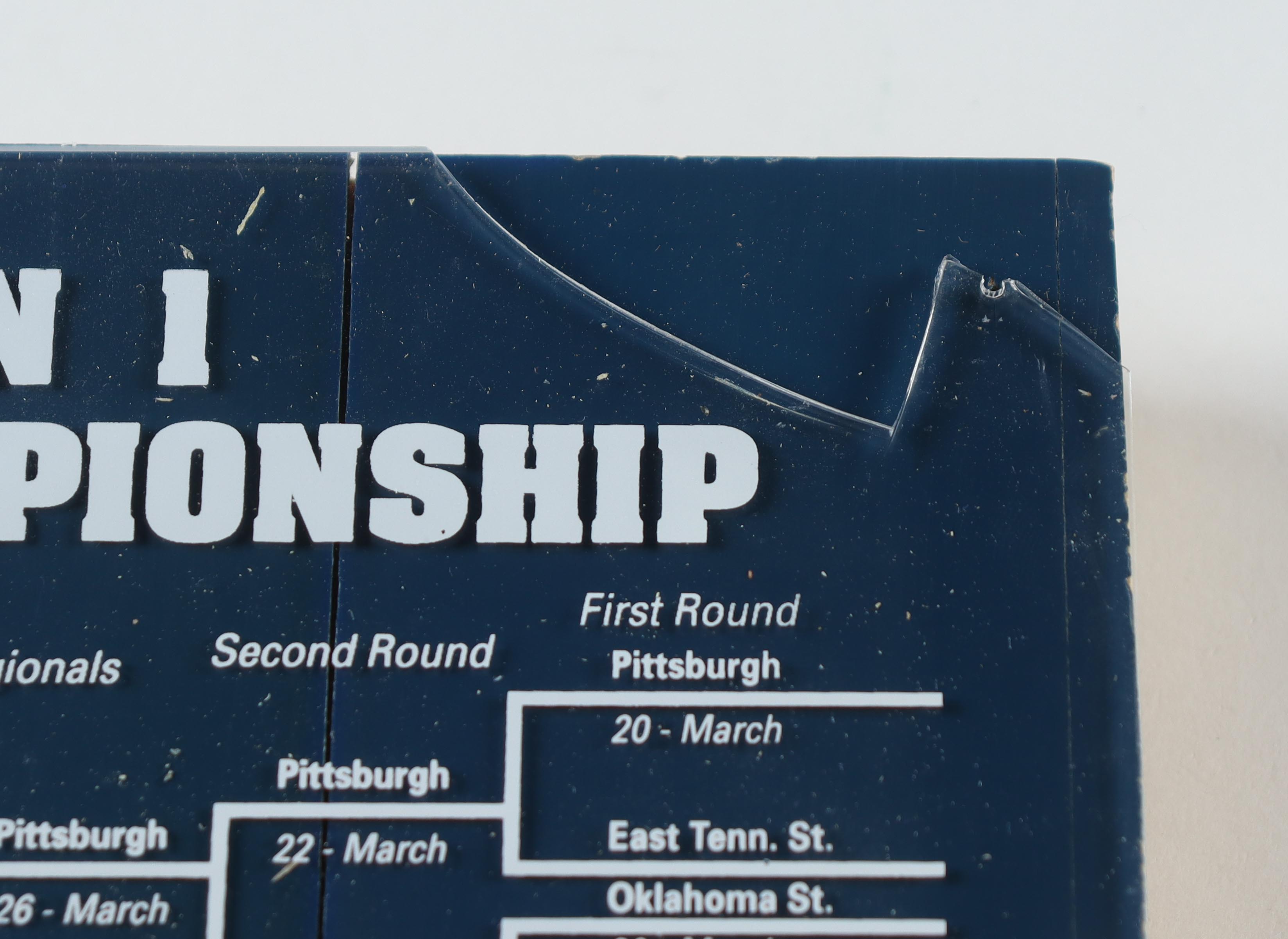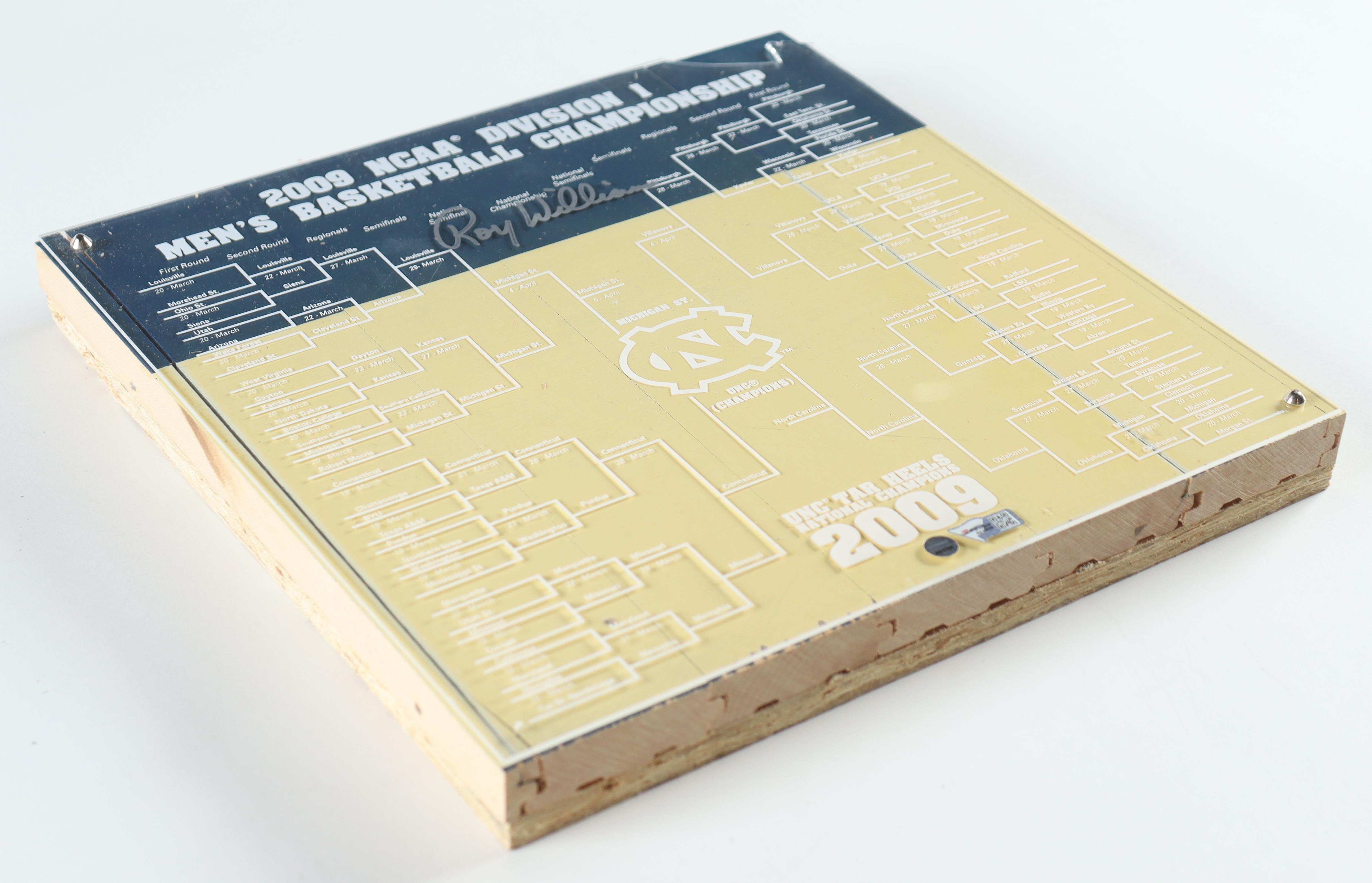 Commemorative wood piece measures 12" x 12" in size and has been hand-signed by Roy Williams (UNC Tar Heels, HOF). Please note there are 2 of the screws missing that hold in the top plexiglass cover and the top right has a piece broken off.