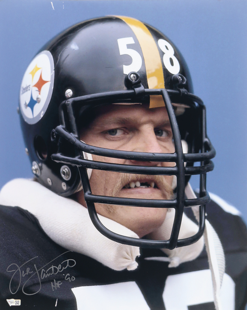 Photo measures 16" x 20" in size. Hand-signed and inscribed by Jack Lambert (Pittsburgh Steelers, HOF). Please note, there are scratch marks on the top and bottom of the photo.