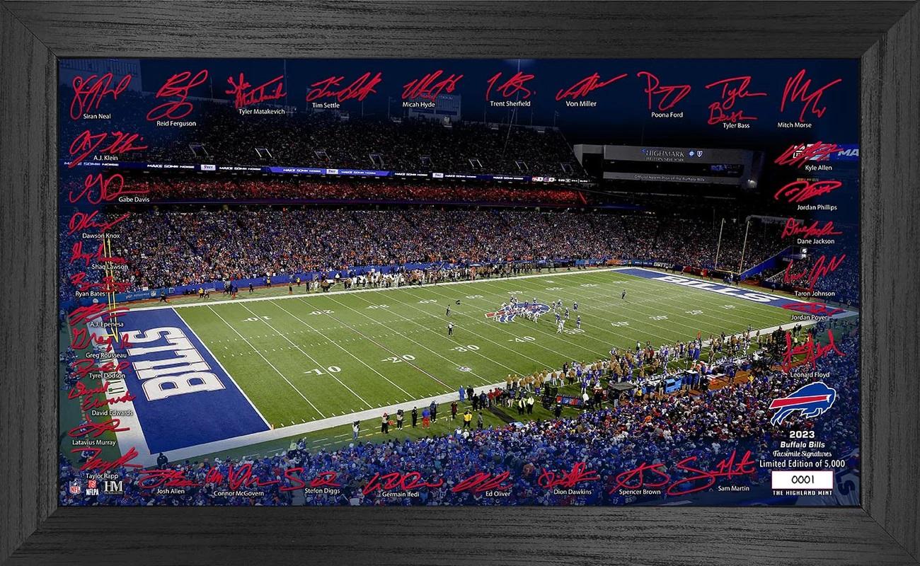 Custom frame measures 12" x 20" in size and features a photo of the stadium for the Buffalo Bills. Please note, the signatures around the print are facsimiles.