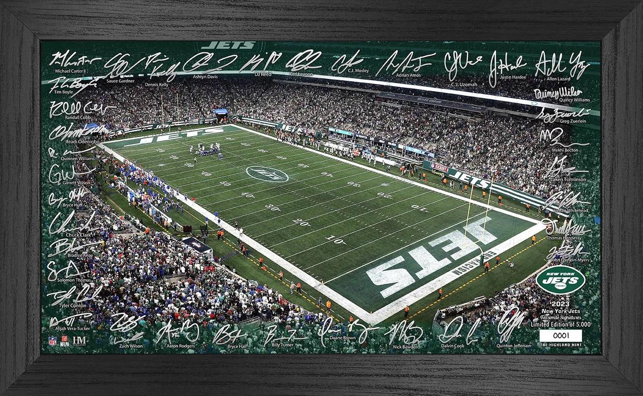 Custom frame measures 12" x 20" in size and features a photo of the stadium for the New York Jets. Please note, the signatures around the print are facsimiles.
