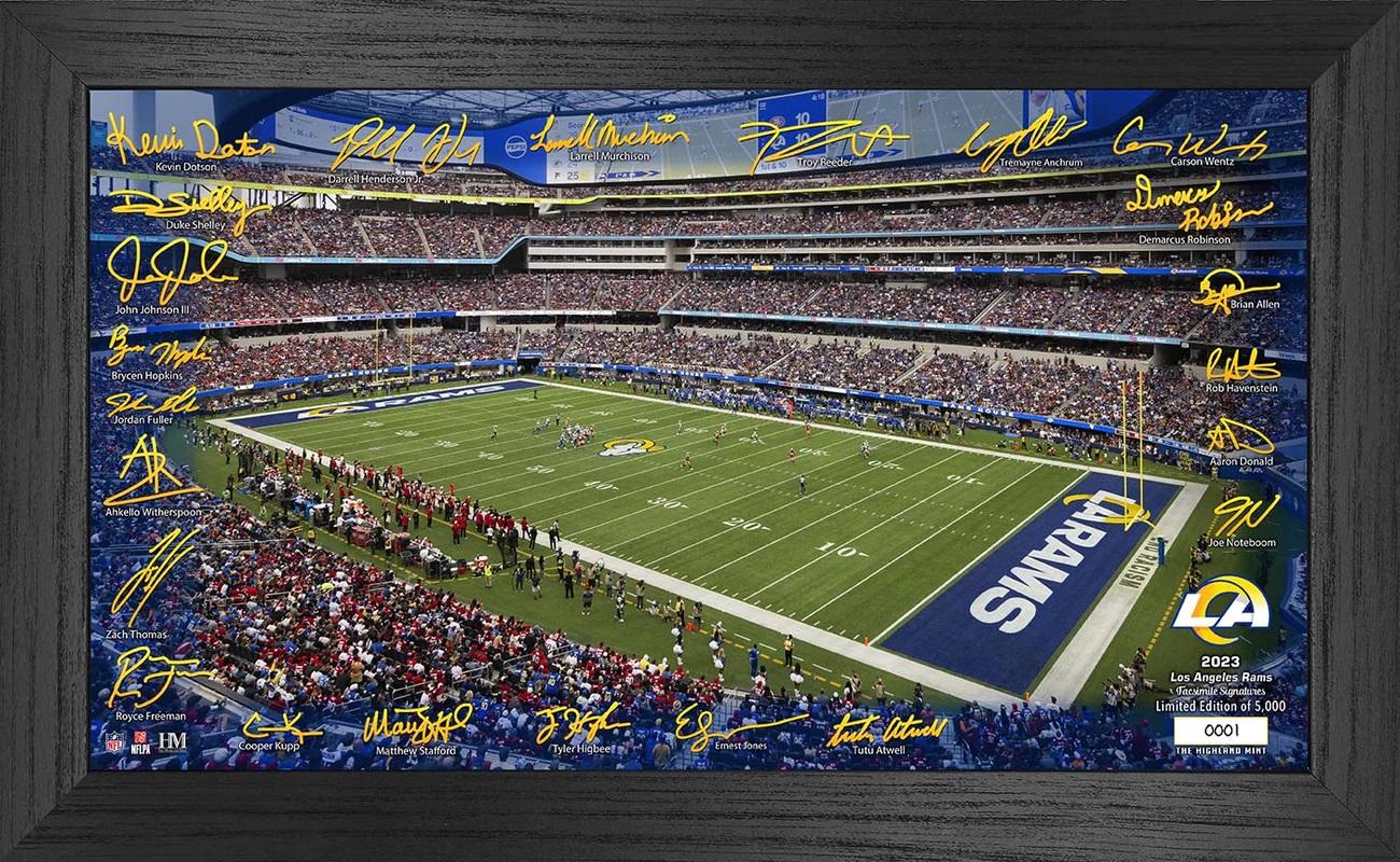 Custom frame measures 12" x 20" in size and features a photo of the stadium for the Los Angeles Rams. Please note, the signatures around the print are facsimiles.