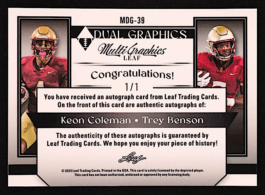Keon Coleman / Trey Benson 2023 Leaf Eclectic Multigraphics Dual Graphics Metalized Sparkles Gold #MDG39 RC #1/1