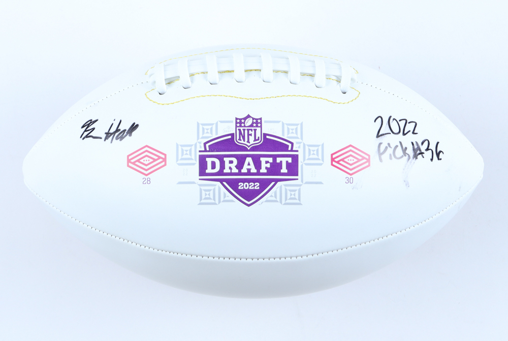 2022 NFL Draft football has been hand-signed and inscribed by Breece Hall. Please note the inscription is smudged.