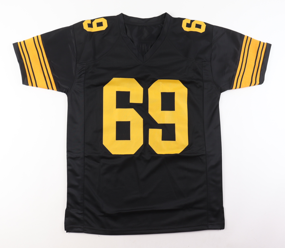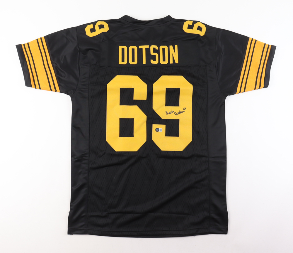 Custom jersey. Everything is sewn on, size XL. Hand-signed by Kevin Dotson. Please note, the signature has bled.