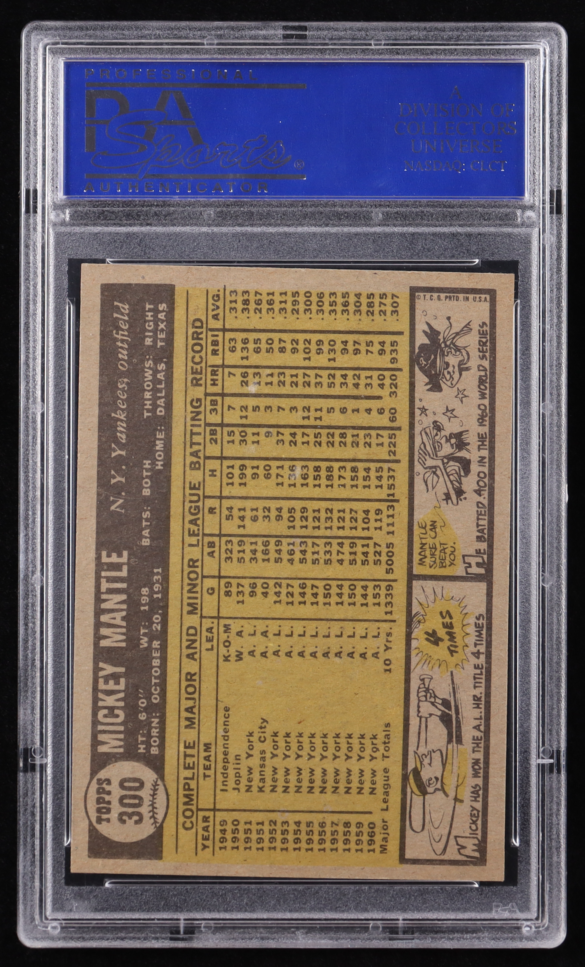 The Mickey Mantle 1961 Topps #300 is a highly coveted baseball card among collectors. Released during Mantle's illustrious career with the New York Yankees, this particular card showcases the iconic switch-hitter in his classic batting stance. The 1961 Topps set is notable for its vibrant colors and clean design, making Mantle's card a standout within the collection. The card's value is driven not only by Mantle's legendary status but also by its historical significance, representing a pivotal era in baseball history. Collectors and enthusiasts often seek out this card as a prized piece of memorabilia, linking them to the golden age of the sport and one of its most iconic figures.